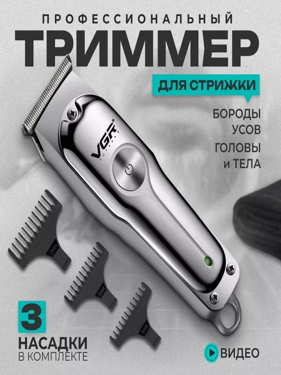 Беспроводной триммер для стрижки волоcв ретро-дизайне.Регулируемая машинка подходит для стрижки волос разной длины, онапредназначена для домашних условий, а также, для профессионального использования в парикмахерских, салонах красоты, барбершопах. Модель отличается ударопрочным цельнометаллическим корпусом, устойчивым к воздействию вибрации, низким уровнем шума, плавным ходом острых лезвий, удобством и длительным сроком эксплуатации.Универсальная модель имеет компактный и стильный винтажный дизайн, отличную эргономику, лёгкий вес и высокую мощность. Машинки с комбинированным питанием работают от аккумулятора или от розетки.Беспроводная машинка для стрижки работает от встроенного Li-Ion аккумулятора до 120 минут при полной зарядке.Работа без провода удобна при стрижке длинных волос и избавляет мастера принимать неудобные положения. Также, машинка может использоваться как проводная от USB, одновременно заряжая батарею. В комплект поставки VGR входят 3 сменные насадки для увеличения высоты среза, зарядное устройство, щёточка для чистки. Особенности:-Мощный роторный двигатель, низкий уровень шума. Комбинированное питание от сети и встроенного аккумулятора,Литиевый аккумулятор 600 mAh обеспечивает до 120 минут работы, полная зарядка за 1.5 часа, индикатор заряда.Высокопроизводительный литий-ионный аккумулятор без эффекта химической памяти, который работает до 3 раз дольше NiMH-аккумуляторов и может заряжаться в любое время, не дожидаясь полной разрядки. Профессиональные высокоуглеродистые ножи отличаются своей твердостью и долговечностью, что позволяет машинке справляться с самыми густыми и жесткими волосами - 3 часто используемых насадки (1/2/3 мм) для точной стрижки, обрезки и бритья. Характеристики: Количество насадок: 3 шт (1 мм, 2 мм, 3 мм)Минимальная длина стрижки:0.5 ммМаксимальная длина стрижки:3 мм Мощность: 5ВтВремя зарядки: 1.5 часаВремя работы от полного заряда: 2 часа (120 мин)Электропитание: 100-240 В 50/60 Гц, аккумулятор Li-Ion 600 mAh