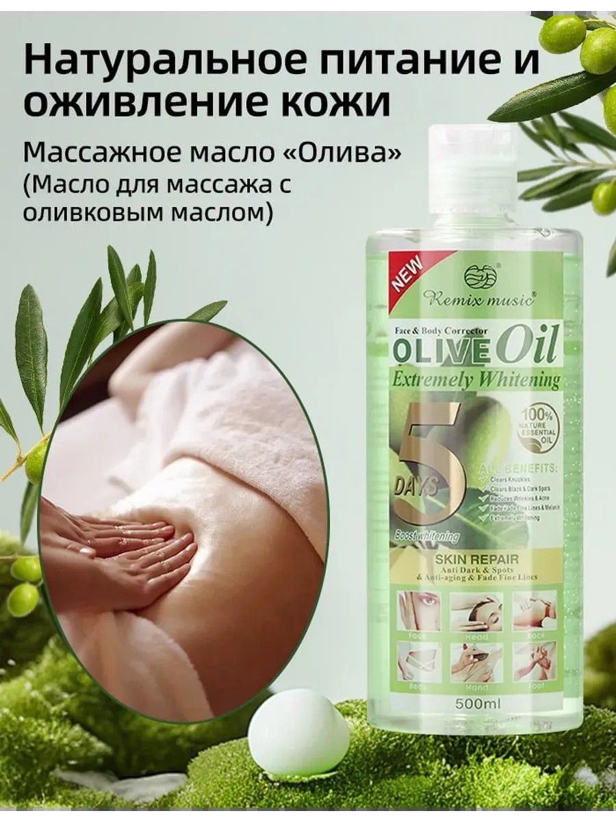 Оливковое массажное масло — это натуральное питание, увлажнение и расслабление в одном средстве. Масло создано из отборных оливок и богато витаминами A, D, E, а также жирными кислотами, которые проникают в глубокие слои кожи, удерживают влагу и улучшают тонус.