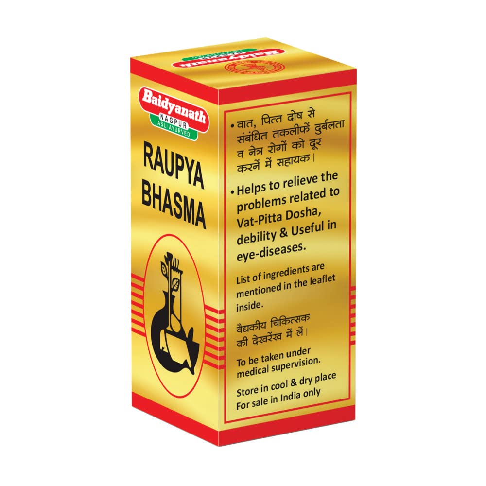 Contenu de l'emballage : 1 x Baidyanath Roupya Bhasma. Utile en prameh, soutien de la santé des yeux. Aide à soulager les problèmes liés à Vat-Pitta Dosha. Roupya Bhasma Flacon de 1 g. Fabriqué par : Shree Baidyanath Ayurved Bhawan Private Limited.