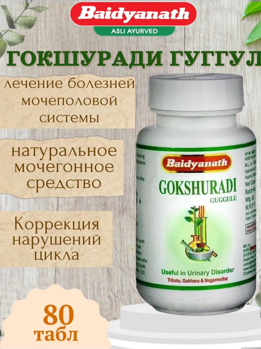 Гокшуради Гуггул от индийского бренда Бадьянах (Kanchnar Guggulu Baidyanath) — натуральное средство аюрведической медицины, которое широко применяется при болезнях мочеполовой системы. Обладает противовоспалительными, болеутоляющими, рассасывающими, мочегонными, омолаживающими, тонизирующими, общеукрепляющими и седативными свойствами. Препарат Gokshuradi способствует растворению камней в почках, безболезненно выводит песок, избавляет от боли, жжения и затрудненного мочеиспускания, купирует воспаления. Гокшуради Гуггул препятствует дальнейшему образованию камней, останавливает кровотечения во время мочеиспускания.