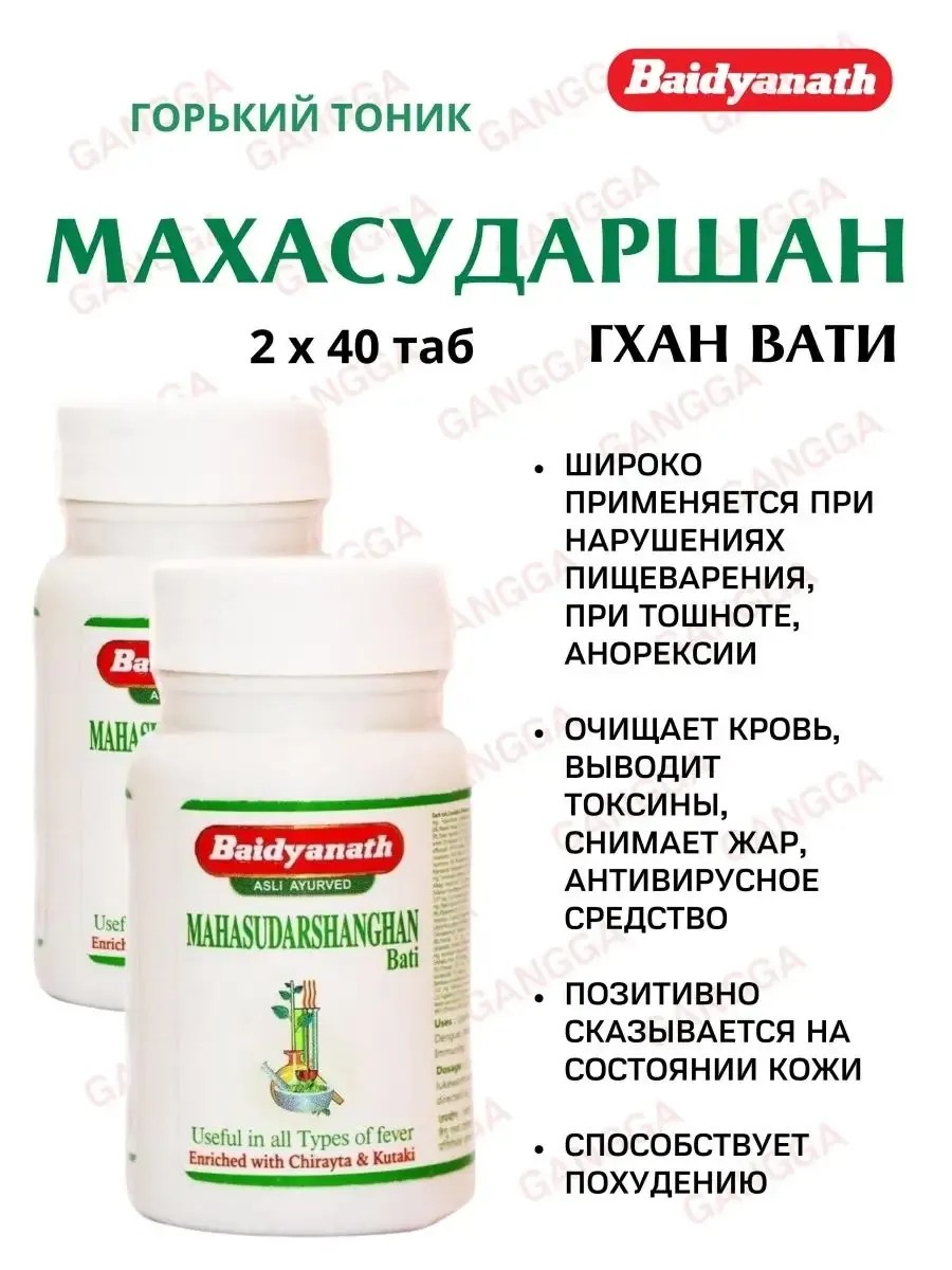 Махасударшан гхан вати (Mahasudarshanghan Bati) компании Baidyanath – эффективный фитопрепарат (Аюрведа), горький тоник, широко применяемый при нарушениях пищеварения (проблемах с печенью, поджелудочной железой – жировом гепатозе, хроническом и остром холецистите, желчнокаменной болезни, панкреатите, при язвенной болезни желудка), при тошноте, анорексии. Препарат оказывает мягкое послабляющее действие, усиливает секрецию желчи, помогает выводить камни из желчного пузыря, уменьшает лимфатические отеки, улучшает пищеварение, помогает для похудения. Его применяют при избыточном употреблении сладкой или жирной пищи, его можно использовать как дополнительное средство при лечении диабета. Быстро снимает последствия алкогольного и пищевого отравления. Это хорошее средство при высокой температуре, лихорадочных состояниях, воспалении, при заболеваниях бронхо-легочной системы. Препарат очищает кровь, выводит токсины с потом и мочой, снимает жар, проявляет себя как антивирусное средство,помогает от паразитов.Полезен для кожи (помогает при акне, экземе, ощущении жжения на коже, аллергических реакциях – крапивнице, зуде и воспаленных рубцах).Благодаря своей горечи хорош для зрения, вызывает охлаждение и очищение глаз, показан при конъюнктивите и головных болях. В составе более пяти десятков трав, базовый ингредиент – Сверция/Шверция Чирата (Swertia chirayita) или трипутник. Взрослым: по 1-2 таблетки 2 раза в день сразу после еды. Детям 3-6 лет: по 0,5 таблетки 1 раз в день после обеда. Детям от 6 лет: по 1 таблетке 1-2 раза в день сразу после еды. Определить индивидуально необходимую дозу и длительность курса приема должен специалист по Аюрведе. Противопоказания: индивидуальная непереносимость; беременность, лактация. Не является лекарственным средстом.