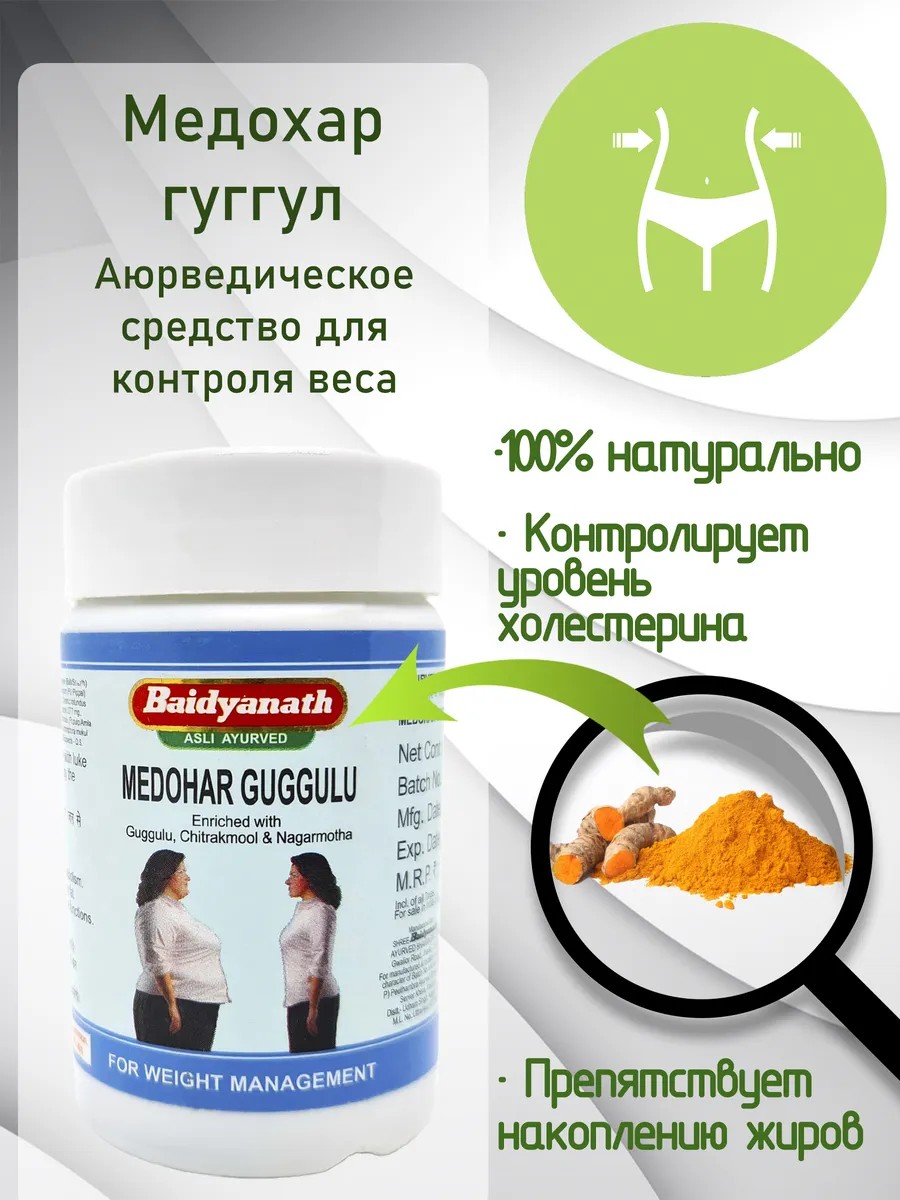 MEDOHAR GUGGUL is an effective drug for controlling blood cholesterol levels and accelerating metabolism. It has a very positive effect on the functioning of the digestive and hepatobiliary systems, prevents fat accumulation, lowers blood lipids, and prevents the formation of atherosclerotic plaques in the arteries, thereby preventing atherosclerosis. Medohara Guggul promotes calorie burning, which, when combined with physical activity, is excellent for weight loss. By normalizing metabolism, it regulates the cardiovascular system, which operates under increased stress due to excess weight and an unhealthy lifestyle. The drug protects blood vessels from such dangerous disorders as changes in vascular lumen, thrombosis, atherosclerosis, and diabetes. Directions: Take 2 tablets twice daily 30 minutes before or one hour after meals. Contraindications: - pregnancy and lactation - hormonal imbalances - postoperative period - thyroid disease.