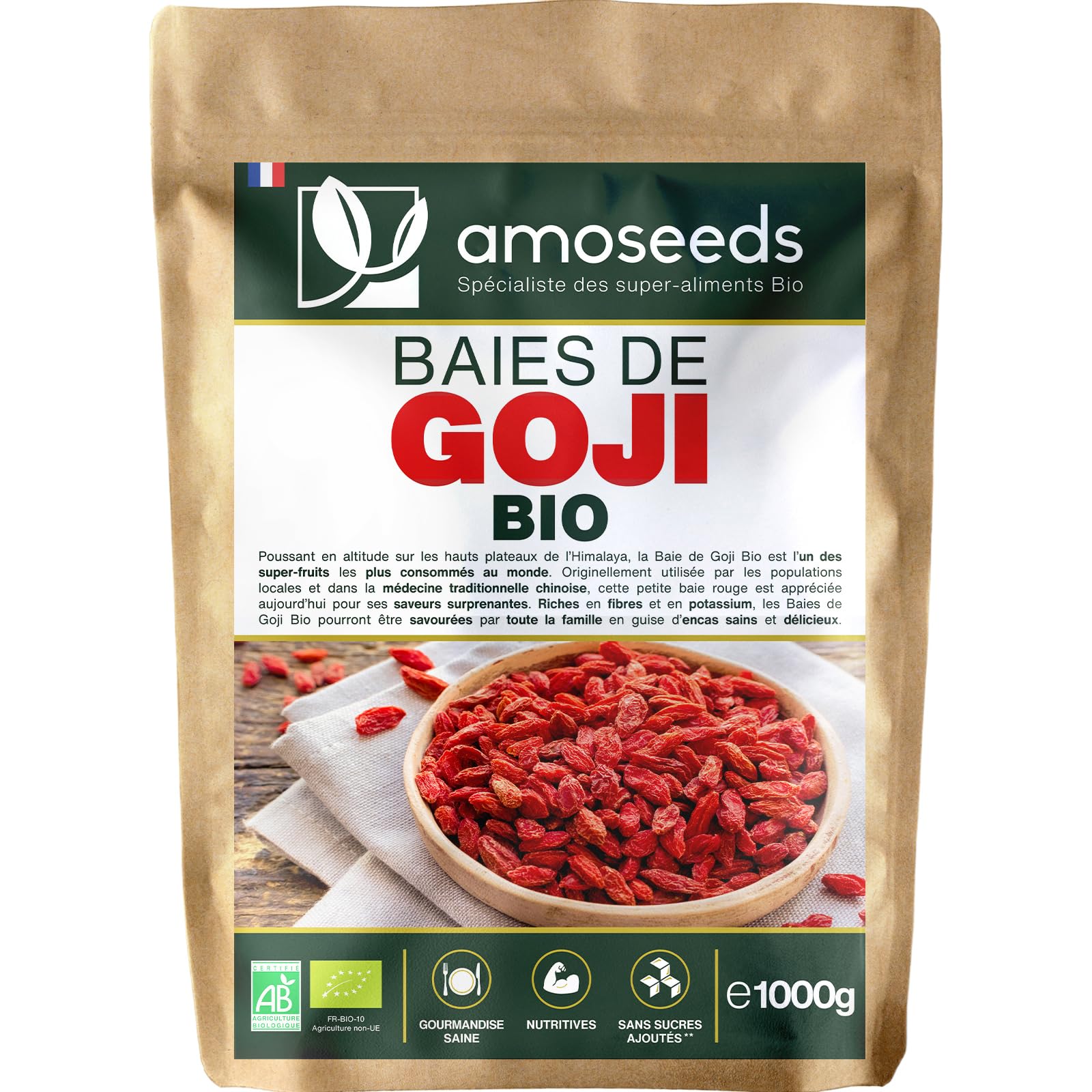? CERTIFIED ORGANIC: 1KG resealable and recyclable Kraft bag of amoseeds Premium Organic Goji Berries. 100 natural, pure, vegan product, with no additives, preservatives, GMOs, pesticides, artificial colors, lactose, soy, or gluten. Each batch is third-party tested to ensure quality and purity. ? GOURMET COOKING: Highly prized for their mild flavor, our Goji Berries can be enjoyed on their own or added to many dishes and desserts. Thanks to their soft texture and slightly sweet and woody notes, they will be enjoyed by the whole family, eaten raw, infused, or added to sweet or savory preparations. ? NUTRITIONAL, HEALTHY SNACK: Exceptional sources of protein, fiber, and potassium, our Organic Goji Berries truly deserve their superfood reputation. Naturally dried at low temperatures, they retain all their nutrients, allowing you to enjoy all their benefits. Highly nutritious, they are perfect for replacing a portion of fresh fruit as a dessert or snack, for both children and adults. ? NO ADDED SUGAR: Our Organic Goji Berries contain no added sugar. After harvesting, they are cleaned, dried at low temperatures, and then packaged. This 100 natural and rigorous manufacturing process allows you to enjoy the delicious taste of Organic Goji Berries and their woody notes, while taking care of your health. ? MUSCLES, SPORTS ACTIVITY: Organic Goji Berries are excellent allies for supporting the health of all athletes. Thanks to their high plant-based protein content, they contribute to the development and maintenance of muscle mass and help maintain normal bone structure. Rich in potassium, these small berries also contribute to the proper functioning of the nervous system, essential during sports activities.? CERTIFIÉES BIOLOGIQUES : sachet Kraft refermable et recyclable de 1KG de Baies de Goji Bio de Qualité Supérieure amoseeds. Produit 100 naturel, pur, vegan, sans additif, sans conservateur, sans OGM, sans pesticides, sans colorant artificiel, sans lactose, sans soja et sans gluten. Chaque lot est testé par des tiers afin de s'assurer de leur qualité et leur pureté. ? CUISINE GOURMANDE : très appréciée pour leurs saveurs douces, nos Baies de Goji peuvent être dégustées telles quelles ou ajoutées dans de nombreux plats et desserts. Grâce à leur moelleux et leurs notes légèrement sucrées et boisées, elles seront appréciées par toute la famille, dégustées crues, infusées ou ajoutées dans une préparation sucrée ou salée. ? NUTRITION, ENCAS SAIN : sources exceptionnelles de protéines, fibres, potassium, nos Baies de Goji Bio méritent bien leur surnom de super-aliments. Séchées naturellement à basse température, elles conservent tous leurs nutriments et vous permettent ainsi de profiter de tous leurs bienfaits. Très nutritives, elles seront parfaites pour remplacer une des portions de fruits frais en guise de dessert ou de collation, pour les petits et les grands. ? SANS SUCRES AJOUTÉS : nos Baies de Goji Bio ne contiennent aucun sucres ajoutés. Après leur récolte, elles sont nettoyées, séchées à basse température avant d'être mises en sachet. Ce processus de fabrication 100 naturel et rigoureux vous permettra de profiter de la gourmandise des Baies de Goji Bio et de leurs notes boisées, tout en prenant soin de votre santé. ? MUSCLES, PRATIQUE SPORTIVE : les Baies de Goji Bio sont d'excellents alliés pour soutenir la santé de tous les sportifs. Grâce à leur richesse en protéines végétales, elles participent au développement et au maintien de la masse musculaire et aident à conserver une ossature normale. Riche en potassium, ces petites baies contribuent également au bon fonctionnement du système nerveux, essentiel lors d'une pratique sportive.Baies de Goji Bio Supérieures 1KG Sans soufre et sans Sucres Ajoutés Himalaya