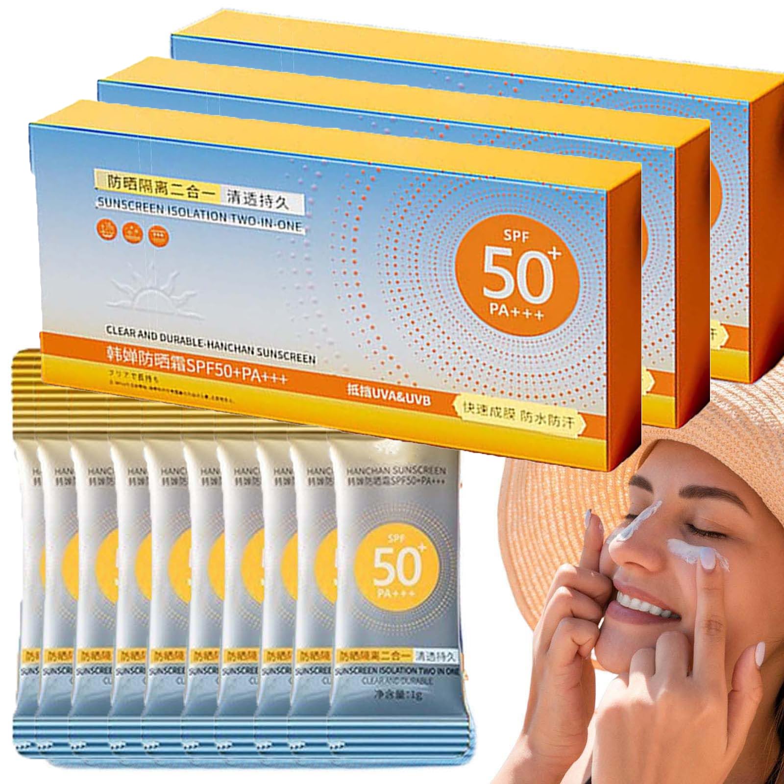 Sun protection for all occasions: This travel sunscreen is suitable for everyone and safe for all skin types. It's water and sweat resistant, so you can enjoy the sun without discoloration or staining. Easy to carry: This travel sunscreen contains 50 individually wrapped sunscreen sachets for safe and hygienic use. They are lightweight, portable, and travel-friendly. You can easily carry it in your pocket and use it anytime. Travel sun protection: With this powerful sunscreen, you can enjoy summer without fear of harmful rays. It protects your skin from radiation and offers SPF 50 PA protection. Lightweight and breathable formula: This travel sunscreen has a gel texture that forms a film on your skin in seconds. It has good elasticity and is easy to apply. Thanks to its lightweight and breathable formula, it protects your skin from sun damage and keeps it hydrated. Moisturizing and soothing: with its nourishing essence, this travel sunscreen soothes and repairs dry and rough skin, leaving you with a hydrated and soft skin texture.