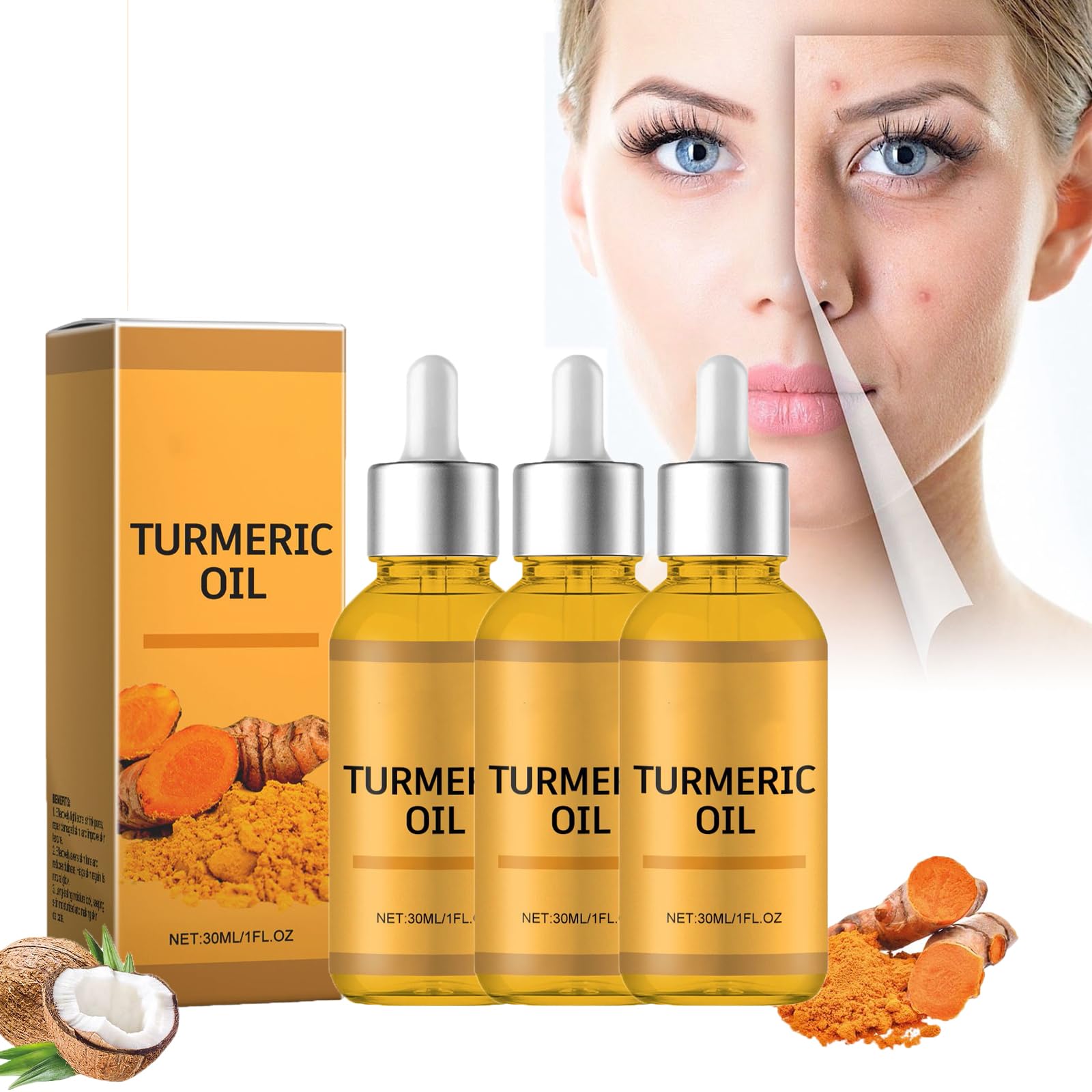 Contents: 1 2 3 Turmeric Dark Spot Corrector Serums Directions for Use: 1. Rinse skin with water to remove any dust particles, then pat dry. 2. Apply 2 to 3 drops of essential oil to a clean palm and apply to the skin. 3. Gently massage with your fingertips until fully absorbed. 4. Follow with your favorite moisturizer morning and night for best results. Use daily for faster results. SAFETY WARNING NOApplication: After cleansing your skin, apply an appropriate amount of turmeric serum to the palm of your hand and apply evenly to the affected area. Gently massage in circular motions until the product is fully absorbed. Use the serum regularly for visible results. Wide range of applications: Turmeric Blemish Serum is suitable for all skin types, including dry, oily, and combination skin. It can be used not only on the face but also on other parts of the body such as the arms, legs, and neck. Natural moisturizer: This turmeric facial serum is enriched with natural ingredients such as turmeric longa extract and olive oil. It hydrates, refreshes, and nourishes the skin. Improves Skin Aging Our serum provides the skin with essential nutrients, hydrates, improves pigmentation, combats dullness, fine lines, wrinkles, sun spots, age spots, and other signs of skin aging, enhances skin radiance, brightens, and evens skin tone. Spot Removal The turmeric spot-removing serum penetrates deep into the skin to effectively dissolve melanin, prevent pigment formation, and lighten freckles, sun spots, etc. It reduces pigmentation, improves dullness and signs of aging, brightens the skin, and evens skin tone.Turmeric Lot de 3 sérums anti-oxydants au curcuma pour corriger les taches brunes, sérum anti-oxydant au curcuma contre les taches de vieillesse, sérum pour tous les types de peau, 30 ml 3 pièces.DESCRIPTION DU PRODUIT DESCRIPTION DU PRODUIT Contenu : 1 2 3 sérums correcteurs Turmeric Dark Spot Correcteur. Mode d'emploi : 1. Rincez la peau avec de l'eau pour éliminer les particules de poussière déposées sur la peau, puis essuyez-la à sec. 2. Appliquez 2 à 3 gouttes d'huile essentielle sur la paume propre et appliquez sur la peau. 3. Masser doucement du bout des doigts jusqu'à ce que la peau soit complètement absorbée. 4. Appliquez ensuite votre crème hydratante préférée matin et soir pour de meilleurs résultats. Utilisez-le quotidiennement pour des résultats rapides. AVERTISSEMENT DE SÉCURITÉ NOApplication : après avoir nettoyé la peau, appliquez une quantité appropriée de sérum de curcuma sur la paume de la main et appliquez uniformément sur la peau à traiter et massez doucement en mouvements circulaires jusqu'à ce que le produit soit complètement absorbé. Utilisez le sérum pendant une longue période pour obtenir des résultats visibles. Large gamme d'applications : le sérum Turmeric Blemish convient à tous les types de peau, peaux sèches, peaux grasses, mixtes. Il peut être utilisé non seulement sur le visage, mais aussi sur d'autres parties du corps telles que les bras, les jambes, le cou, etc. Hydratant naturel : le sérum pour le visage au curcuma est enrichi en ingrédients naturels tels que l'extrait de curcuma longa, l'huile d'olive, etc. Il hydrate, rafraîchit et nourrit la peau. Améliore le vieillissement de la peau Notre sérum fournit à la peau les nutriments nécessaires, l'hydrate, améliore la pigmentation, combat la peau terne, les ridules, les rides, les taches solaires, les taches de vieillesse et d'autres problèmes de vieillissement cutané, améliore la luminosité de la peau, l'éclaircit et unifie le teint de la peau. Élimination des taches Le sérum détachant au curcuma pénètre profondément dans la peau pour dissoudre efficacement la mélanine, prévenir la formation de pigments, éclaircir les taches de rousseur, les taches de soleil, etc. Il réduit la pigmentation, améliore la ternissure et le vieillissement de la peau, éclaircit la peau et unifie le teint.