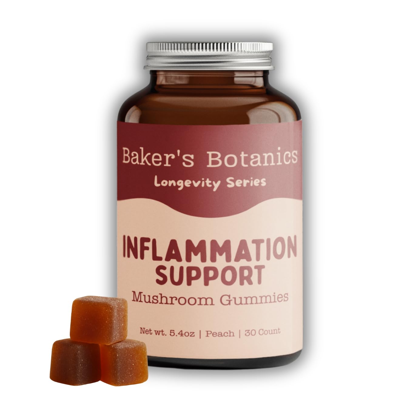 Baker's Botanics Longevity Inflammation Support Gummies - Mushroom Gummies for Complete Women Wellness | Chaga, Maitake, Turmeric, Astragalus & Zinc | Peach Flavor | Vegan, Gluten-Free, Non-GMO Inflammation Response