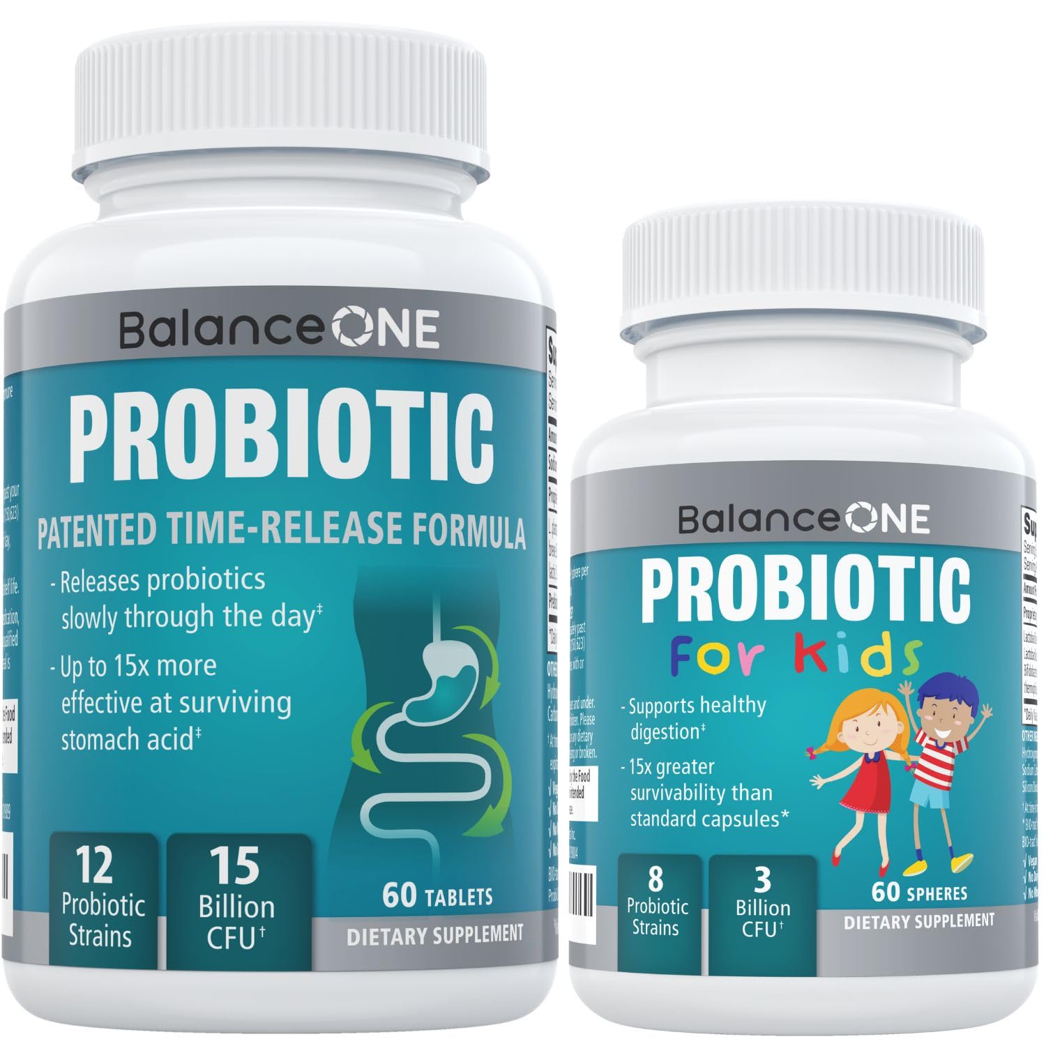 Give your whole family the gut health support they need with the Balance One Family Probiotic Bundle! This bundle includes Balance One Probiotic for adults and Balance One Kids Probiotic, providing targeted digestive and immune support for every age. Our adult probiotic delivers 15 billion CFUs and 12 clinically studied strains using a patented time-release formula that protects probiotics from stomach acid, ensuring they reach deep into the gut for maximum effectiveness. The Kids Probiotic is a gentle yet powerful formula with 3 carefully selected strains to promote healthy digestion and immune function in growing children. Both probiotics are shelf-stable and require no refrigeration, making them perfect for home or travel. Adults get an easy-to-swallow tablet, while kids enjoy a mild, chewable probiotic with no sugar, artificial flavors, or synthetic additives. Made in the USA with the highest quality standards, our probiotics are dairy-free, soy-free, gluten-free, and non-GMO, so you can feel confident in what you're giving your family. Balance One Family Probiotic Bundle – Pure, Effective, and Made for the Whole Family!PURE, CLEAN, AND FREE FROM ALLERGENS. Made in the USA, our probiotics contain no dairy, soy, gluten, GMOs, or unnecessary additives—just clean, effective ingredients for optimal gut health. NO REFRIGERATION NEEDED, EASY TO TAKE. Our shelf-stable probiotics are perfect for home or travel. Adults take one easy-to-swallow tablet daily, while kids enjoy a mild, chewable tablet with no artificial flavors or sugar. 15 BILLION CFUS TARGETED STRAINS. Balance One Probiotic delivers 15 billion CFUs with 12 strains for adults, while the Kids Probiotic provides gentle yet effective support with 3 strains, carefully selected for growing tummies. TIME-RELEASE DELIVERY FOR MAXIMUM EFFECTIVENESS. Both formulas use patented time-release technology to protect probiotics from stomach acid, ensuring they reach deep into the gut for better absorption. COMPLETE FAMILY GUT HEALTH SUPPORT. This bundle includes a bottle of our Balance One Probiotic and a bottle of our Kids Probiotic, providing comprehensive digestive and immune support for the whole family.