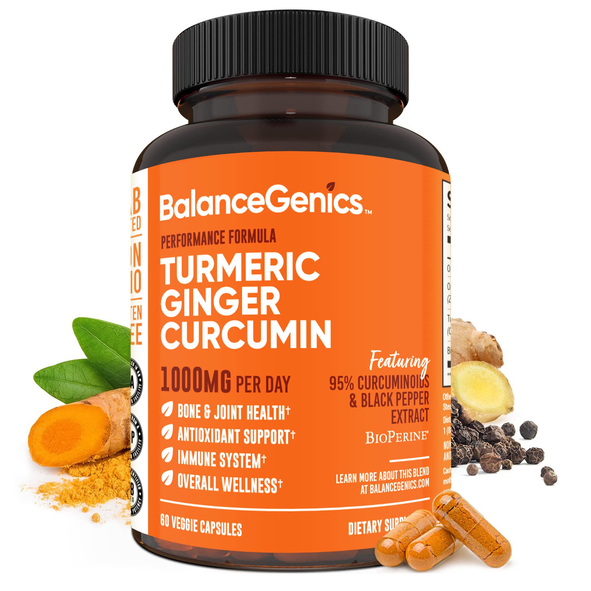 BalanceGenics Turmeric Curcumin Supplement with Black Pepper & Ginger Root 1000mg | Optimized Formula 95% Curcuminoids Curcuma | Joint Health & Inflammation Support | 60 Capsules Powder Filled
