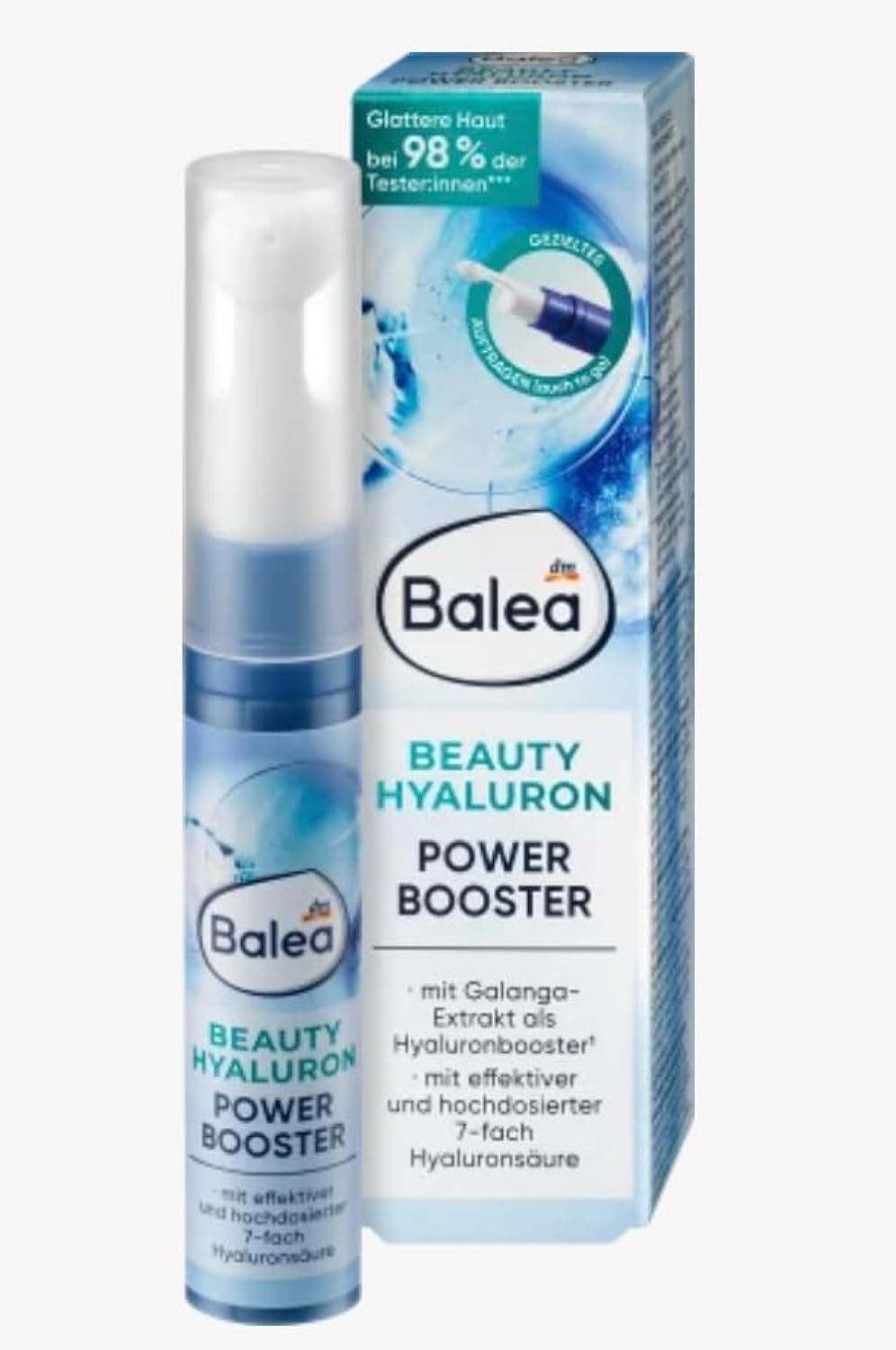 With galangal extract as a hyaluronic booster, featuring a high concentration of 7x effective hyaluronic acid. Smoother skin in 98 of testers: the formula is free of microplastics and water-soluble synthetic polymers. Perfect beauty: Balea Beauty Hyaluronic Acid effectively improves skin tone – for smooth, firm, and even-toned skin. The combination of 7x hyaluronic acid and galangal extract forms a protective film on the skin, instantly smoothing it. The Power Booster penetrates quickly and intensely hydrates. Wrinkles and fine lines are visibly reduced. The 7x hyaluronic acid also penetrates the deeper layers of the skin, providing precious hydration. The high concentration of hyaluronic acid softens wrinkles and smooths the skin instantly. It has been proven to improve skin elasticity. Galangal extract stimulates the body's production of hyaluronic acid. SAFETY WARNING Warning: Avoid contact with eyes. If the product gets into the eyes, rinse thoroughly with clean water. If irritation occurs, discontinue use. Keep out of reach of children.