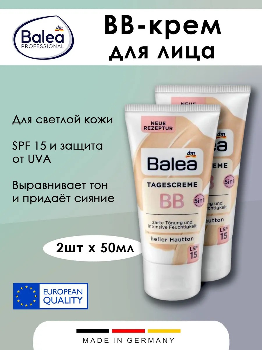 BB-крем Balea для светлой кожи, SPF 15, 50 мл, 2 шт. BB-крем Balea для светлого тона кожи SPF 15 обеспечивает интенсивное увлажнение и придает естественный оттенок коже. Микродисперсные светоотражающие цветные пигменты адаптируются к естественному тону кожи. Скрывает неровности кожи. Формула с витамином Е и натуральным маслом персиковых косточек придает уставшей коже свежесть и сияющий цвет лица. SPF 15 и защита от UVA защищают кожу от преждевременного фотостарения. . Особенности продукта: Для нормальной кожи, с солнцезащитным фактором (SPF), без спирта, веганский. Инструкции по использованию: Нанесите BB-крем на лицо после очищения кожи. Распределите равномерно. Избегайте области вокруг глаз.