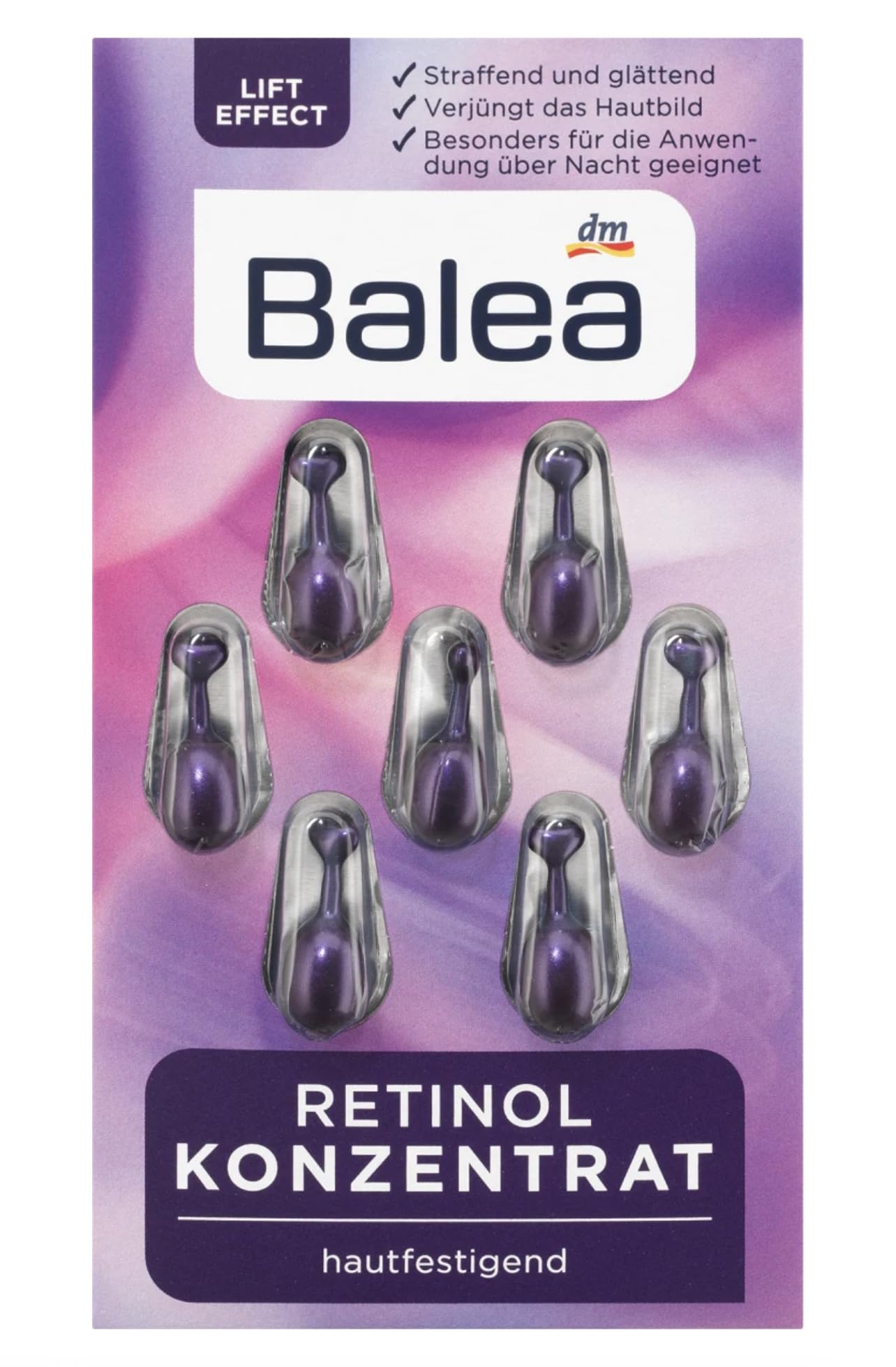 Balea Concentrate Retinol, 7 pcs Skin Type: Mature Scope of application: face Product properties: particularly suitable for the face, with retinol (vitamin A), without alcohol, without aluminum salts, without dyes, without nanoparticles, without parabens, without paraffins / mineral oils, pH skin-neutral Texture / Consistency / Application: Cream / Mousse SAFETY WARNING Consult with a doctor before using this product