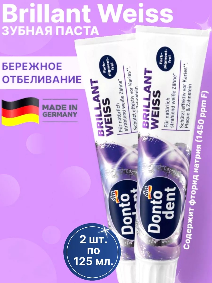 Набор состоит из 2 штук Зубной пасты Dontodent Brillant Weiss для чистки и отбеливания зубов. Потребление никотина, кофе, чая и других продуктов может вызвать потемнение эмали. Богатая формула зубной пасты поможет вам бережно очистить зубы не повреждая эмаль, защитить от разрушения и появления зубного камня. Паста подходит для ежедневного использования. Только для взрослых.
