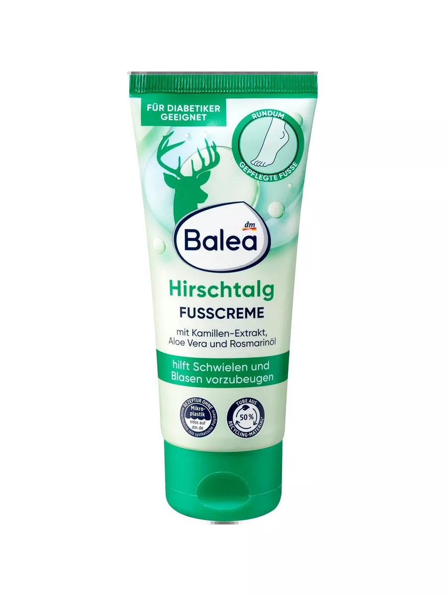 Helps prevent calluses and blisters. With chamomile extract, aloe vera, and rosemary oil. Formulated without microplastics or water-soluble, purely synthetic polymers. Packaging made from 50% recycled material. Specially designed for the care of very rough, damaged, and cracked skin, Balea foot cream helps prevent blisters, calluses, and the formation of calluses. The care formula with natural deer fat and aloe vera has a preventative effect against calluses and pressure on the skin, forming a protective layer with reverse lubrication. The valuable composition with rosemary oil, chamomile extract, and bisabolol soothes damaged skin, leaving it firm and elastic.