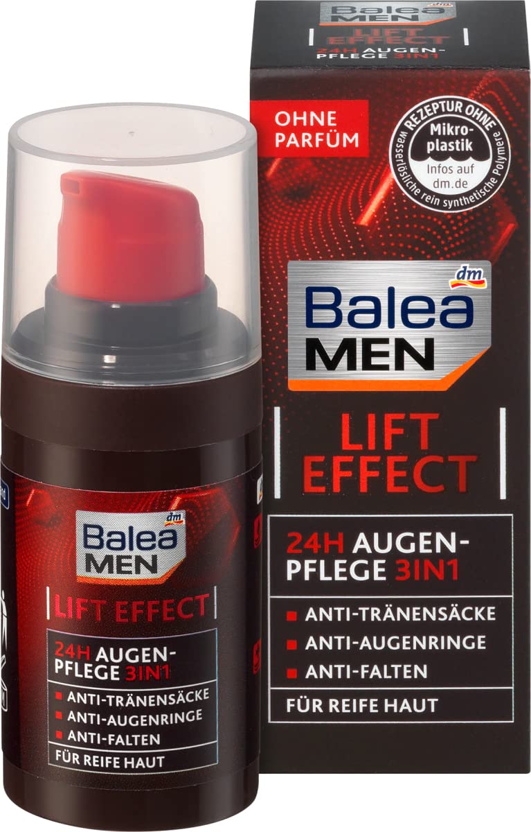 Balea men eye cream lift effect 24h, 1 x 15 ml Balea men lift effect 24h eye care 3in1 strengthens and maintains the skin of the eye area.The highly effective formula with the vital-active complex is mitigating dark circles, tear bags and folds.Providing reduction in the depth of wrinkles with regular use.Canola oil, shea butter and a moisture-ready dispenser maintain the sensitive eye area.The eye area looks fresh and revitalized.Perfume -free.Less reading without perfume This product does not contain any fragrances added to the fragrance effect.Without perfume without perfume without aluminum salts This product does not contain aluminum salts.Without aluminum salts without aluminum salts vegan This product is vegan and does not contain any animal contents or auxiliary materials.Vegan vegan ingredients aqua,CococaPrylate Caprate,Diethylhexyl carbonate,Glycerin,Cetearyl Isononanoate,Cetearyl Olivate,Sorbitan Olivate,Butylene glycol,Cetearyl Alcohol,Butrospermum Parkii Butter,Canola Oil,Caffeine,Chondrus Crispus Powder,Acetyl hexapeptide-8,Glyceryl Oleate,Mannitol,Lecithin,Acetyl tetrapeptide-5,Dimethicone,Ascorbyl palmitate,Laminaria Digitata Extract,Carbomer,Xanthan Gum,Glycogen,Caprylyl Glycol,Glyceryl stearate,Tocopherol,Sodium hydroxides,Phenoxyethanol,Benzoo acid,Dehydroacetic acid,Citric acid.Apply usage instructions in the morning and in the evening after cleaning evenly to the skin area under the eye.Avoid direct eye contact.Balea men eye cream lift effect 24h, 1 x 15 ml.Balea MEN Augencreme lift effect 24h, 1 x 15 ml Balea MEN lift effect 24h Augenpflege 3in1 festigt und pflegt die Haut der Augenpartie. Die hochwirksame Formel mit dem Vital-Aktiv-Komplex mildert Augenringe, Tränensäcke und Falten. Nachweisliche Reduktion der Faltentiefe bei regelmäßiger Anwendung. Canolaöl, Sheabutter und ein Feuchtigkeits-Sofortspender pflegen die empfindliche Augenpartie. Die Augenpartie wirkt frisch und revitalisiert. Parfümfrei. Weniger lesen Ohne Parfum Dieses Produkt enthält keine für die Duftwirkung zugesetzten Duftstoffe. Ohne Parfum Ohne Parfum Ohne Aluminiumsalze Dieses Produkt enthält keine Aluminiumsalze. Ohne Aluminiumsalze Ohne Aluminiumsalze Vegan Dieses Produkt ist vegan und enthält keine tierischen Inhalts- oder Hilfsstoffe. Vegan Vegan Inhaltsstoffe AQUA,COCOCAPRYLATE CAPRATE,DIETHYLHEXYL CARBONATE,GLYCERIN,CETEARYL ISONONANOATE,CETEARYL OLIVATE,SORBITAN OLIVATE,BUTYLENE GLYCOL,CETEARYL ALCOHOL,BUTYROSPERMUM PARKII BUTTER,CANOLA OIL,CAFFEINE,CHONDRUS CRISPUS POWDER,ACETYL HEXAPEPTIDE-8,GLYCERYL OLEATE,MANNITOL,LECITHIN,ACETYL TETRAPEPTIDE-5,DIMETHICONE,ASCORBYL PALMITATE,LAMINARIA DIGITATA EXTRACT,CARBOMER,XANTHAN GUM,GLYCOGEN,CAPRYLYL GLYCOL,GLYCERYL STEARATE,TOCOPHEROL,SODIUM HYDROXIDE,PHENOXYETHANOL,BENZOIC ACID,DEHYDROACETIC ACID,CITRIC ACID. Verwendungshinweise Morgens und abends nach der Reinigung gleichmäßig auf die Hautpartie unter dem Auge auftragen. Direkten Augenkontakt vermeiden.Balea MEN Augencreme lift effect 24h, 1 x 15 ml.Balea MEN Augencreme lift effect 24h, 1 x 15 ml