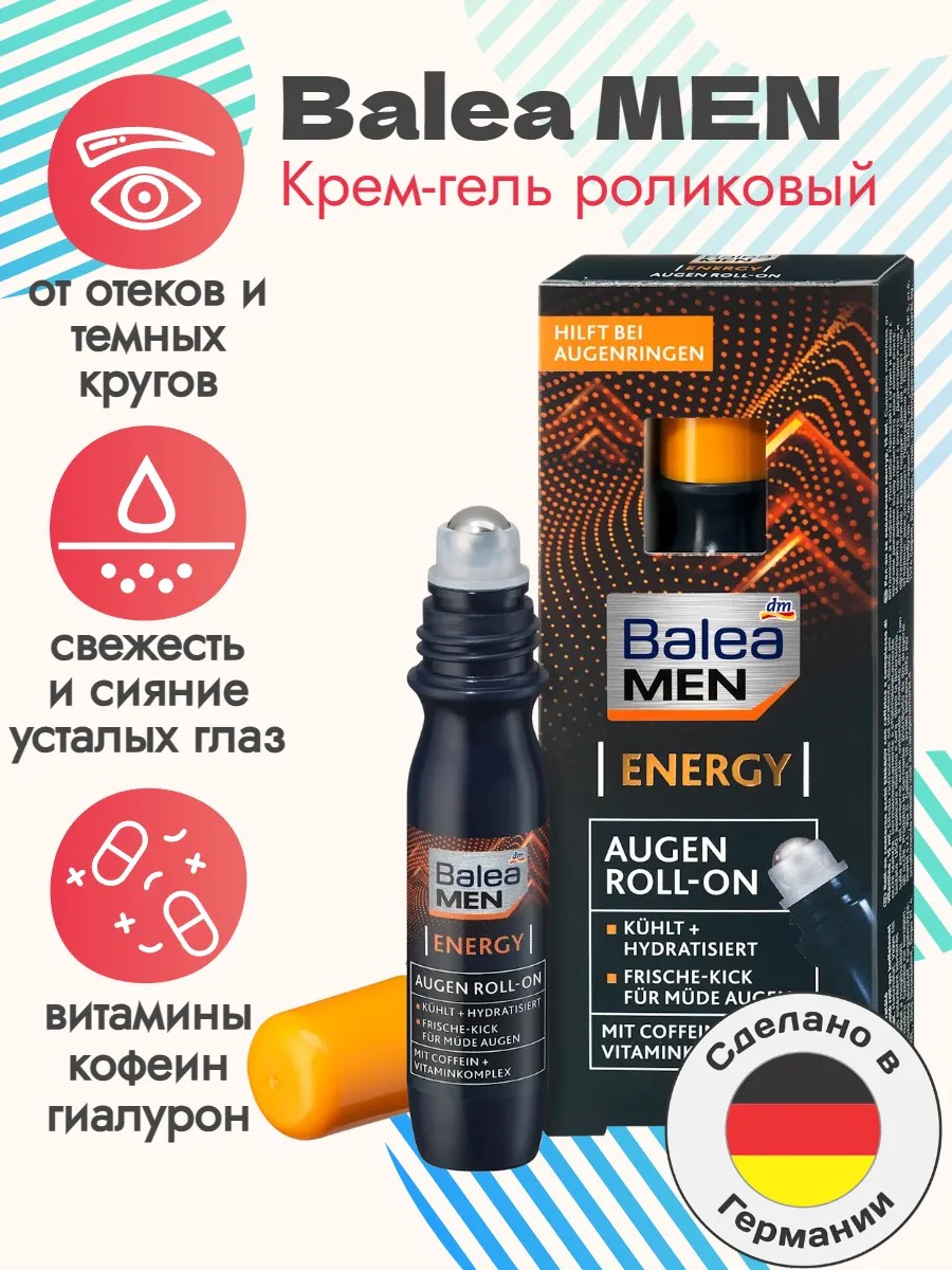 Помогает при признаках усталости и стресса (темные круги и отеки под глазами) Охлаждает и увлажняет С кофеином и витаминным комплексом Бодрящая свежесть на каждый день: роликовый крем глаз Balea MEN energy помогает при признаках усталости и стресса, после которых появляются темные круги и отеки под глазами. Система Roll-on с массажным, охлаждающим эффектом специально подходит для чувствительной области глаз. Содержащаяся в креме гиалуроновая кислота связывает воду и увлажняет, в то время как состав с липидами сохраняет кожу мягкой и эластичной. Для свежего сияния! Рецепт без микропластика и водорастворимых чисто синтетических полимеров.