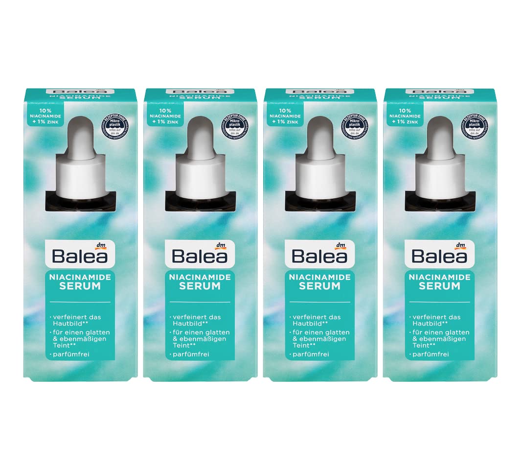 The Balea niacinamide serum provides a smoother skin surface . The light gel serum regulates the skin's natural sebum production and reduces the appearance of enlarged pores. It supports a clearer and noticeably more even complexion. The active care formula: with 10 niacinamide refines enlarged pores, compensates for imperfections and strengthens the natural skin barrier. - With 1 of the trace element zinc, it has a semi-regulating effect, can prevent clogged pores and impurities and is therefore also suitable for oily and combination skin. - With panthenol, allantoin and aloe vera promotes skin regeneration and provides beneficial hydration . In-vivo study with 33 testers after 4 weeks of use. Self-assessment by 33 testers after 4 weeks of use. pH value: 4.5 Formula without microplastics and water-soluble purely synthetic polymers. Instructions for use: Apply a few drops of the economical serum to the cleansed skin of the face, neck and décolleté in the morning and evening, if necessary, and massage in gently. For optimal removal, immerse the empty pipette in the bottle with the suction cap pressed, let go, remove the filled pipette and dose the serum. Avoid contact with eyes and mucous membranes. Ingredients: AQUA, niacinamide, glycerin, pentylene glycol, aline barbadensis leav, sinc pca, panthenol, phenoxyethanol, cellulose rubber, allantoin, sodium benzoate, citric acid, xanthan rubber, ethyllose. HEXYLGLYC: ERIN, TRISODIUM ETYLENEDIAMINE DISUCCINATES, SODIUM HYALURONATES. Made for: dm-drierie markt GmbH Co. KG, Am dm-Platz 1, 76227 Karlsruhe. INGREDIENTS Aqua, niacinamide, glycerin, penylene glucol, aloe barbadensis juice, zinc pca, panthenol, phenoxyethanol, cellulose rubber, allantoin, sodium benzoate, citric acid, xanthan rubber, ethylhexyl glow. Ycerin, TRISODIUM ETHYLENEDIAMINE DISUCCINATES, SODIUM HYALURONATES. SAFETY WARNING Avoid contact with eyes and mucous membranes. Use only on intact skin. Avoid direct sunlight. Do not store above 25 degrees Celsius. Keep out of reach of children See moreFragrance-free. For a smooth and even complexion. Refines enlarged pores . Refines the skin image. With 10 niacinamide and 1 zinc. Balea Niacinamide Serum, 4 pieces (4 x 30 ml), 120 ml.Balea Niacinamide Gel Serum met 10 niacinamide en 1 zink voor een mooie en versterkte huid - parfumvrij, 4 stuks (4 x 30 ml), 120 ml Het Balea niacinamide serum zorgt voor een gladder huidoppervlak . Het lichte gelserum reguleert de natuurlijke talgproductie van de huid en vermindert het uiterlijk van vergrote poriën. Het ondersteunt een heldere en merkbaar gelijkmatigere teint. De actieve verzorgingsformule: met 10 niacinamide verfijnt vergrote poriën, compenseert oneffenheden en versterkt de natuurlijke huidbarrière. - Met 1 van het sporenelement zink werkt semi-regulerend, kan verstopte poriën en onzuiverheden voorkomen en is daardoor ook geschikt voor olieachtige en gemengde huid. - Met panthenol, allantoïne en aloë vera bevordert de regeneratie van de huid en zorgt voor een weldadige hydratatie . In-vivo studie met 33 teststers na 4 weken gebruik. Zelfbeoordeling door 33 teststers na 4 weken gebruik. pH-waarde: 4,5 formule zonder microplastic en in water oplosbare zuiver synthetische polymeren. Gebruiksaanwijzing: 's ochtends en 's avonds indien nodig een paar druppels van het zuinige serum aanbrengen op de gereinigde huid van gezicht, hals en decolleté en zachtjes inmasseren. Voor een optimale uitname lege pipet met ingedrukt zuighoedje in de fles onderdompelen, loslaten, gevulde pipet uitnemen en het serum doseren. Vermijd contact met ogen en slijmvliezen. Ingrediënten: AQUA, niacinamide, glycerine, pentyleen glycol, aline barbadensis leav, sinc pca, panthenol, fenoxyethanol, cellulose rubber, allantoïne, natriumbenzoaat, citroenzuur, xanthaanrubber, ethyllose. HEXYLGLYC: ERIN, TRISODIUM ETYLENEDIAMINE DISUCCINATEN, SODIUM HYALURONATEN. Gemaakt voor: dm-drogerie markt GmbH Co. KG, Am dm-Platz 1, 76227 Karlsruhe. INGREDIËNTEN Aqua, niacinamide, glycerine, penyleen glucol, aloë barbadensissleaap sap, zink pca, panthenol, fenoxyethanol, cellulose rubber, allantoïne, natriumbenzoaat, citroenzuur, xanthaanrubber, ethylhexylgloed. Ycerin, TRISODIUM ETHYLENEDIAMINE DISUCCINATEN, SODIUM HYALURONATEN. VEILIGHEIDSWAARSCHUWING Vermijd contact met ogen en slijmvliezen. Alleen gebruiken op een intacte huid. Vermijd direct zonlicht. Niet boven 25 graden Celsius bewaren. Buiten het bereik van kinderen houden Meer bekijkenParfumvrij. Voor een gladde en gelijkmatige teint. Verfijnt vergrote poriën . Verfijnt het huidbeeld. Met 10 niacinamide en 1 zink. Balea Niacinamide Serum, 4 stuks (4 x 30 ml), 120 ml.