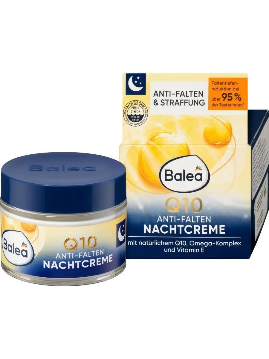 Balea Крем для лица ночной Q10 Anti-Falten против морщин способствует регенерации кожи в ночное время. Благодаря высококонцентрированной формуле с незаменимыми жирными кислотами укрепляет кожу и делает ее более плотной, повышает эластичность и упругость, питает и увлажняет. Коэнзим Q10 является эффективным источником энергии для клеток и активно способствует регенерации кожи замедляя процессы естественного старения. Регулярное использование крема снижает выраженность воспалительных процессов на коже. Крем активно борется с мимическими и возрастными морщинами. Провитамин B5 обеспечивает вашей коже интенсивное увлажнение, разглаживает кожу и предотвращает появление новых морщин. Глубина морщин заметно снижена после 4-х недель регулярного использования, подтверждено научными испытаниями.