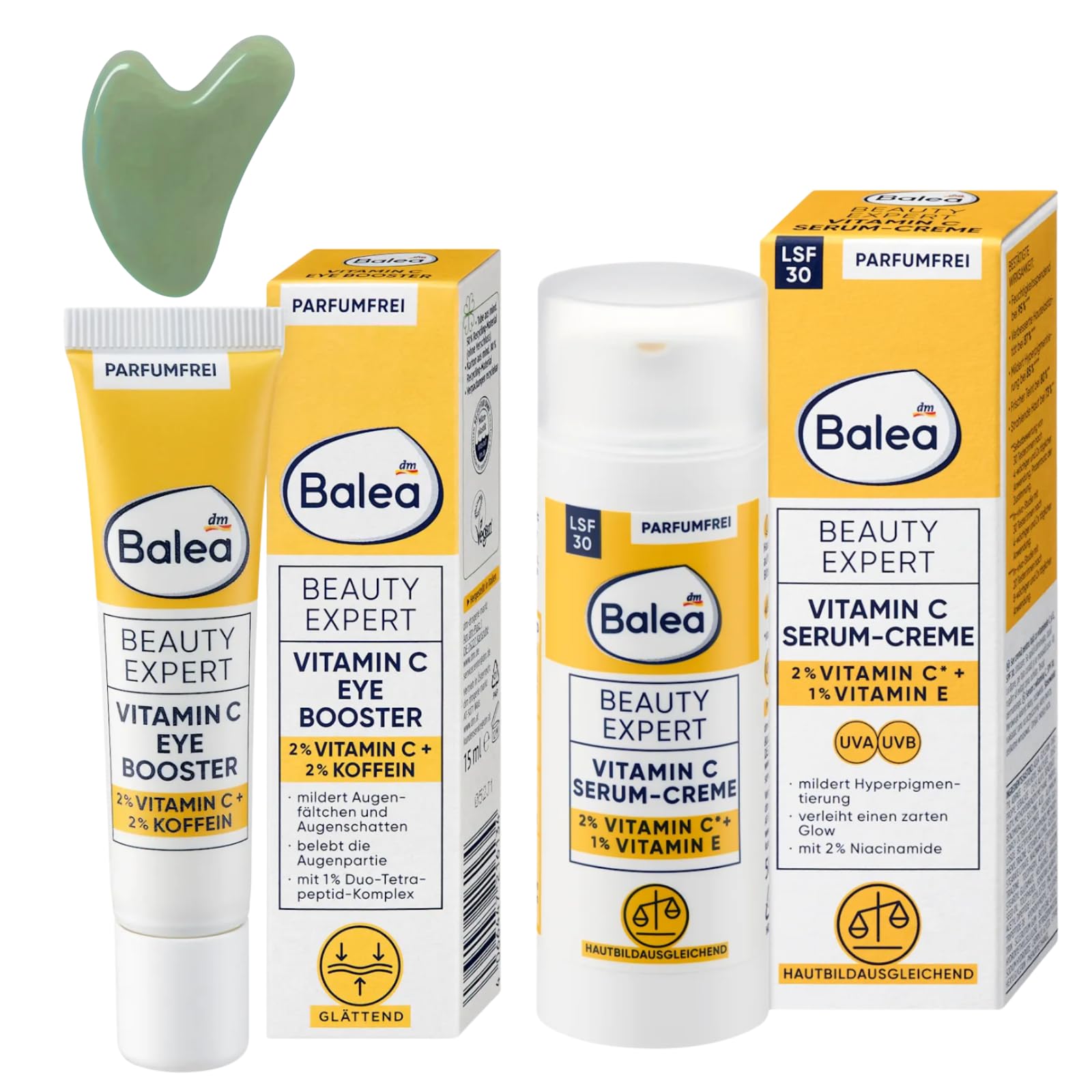 This set of two exclusive Balea Beauty Expert products combines highly effective skincare with a luxurious beauty tool for visibly more radiant skin. The Vitamin C Serum Cream SPF 30 contains a powerful formula with 2 Vitamin C, 1 Vitamin E, and 2 Niacinamide that softens hyperpigmentation, evens skin tone, and provides a fresh, even glow. The built-in SPF 30 also offers reliable protection against light-induced skin aging and prevents dark spots – fragrance-free and microplastic-free. The Vitamin C Eye Booster Cream has been specially formulated for the delicate eye area. With 2 Vitamin C, 2 Caffeine, and 1 Duo-Tetrapeptide Complex, it reduces dark circles, puffiness, and fine lines, promotes collagen production, and revitalizes tired eyes. In addition to its exclusive features, the Bonus Gua Sha facial massager provides a gentle massage that stimulates blood circulation, improves the absorption of active ingredients, and ensures a fresh, toned complexion. SAFETY WARNING For external use only. Avoid contact with eyes and mucous membranes. Keep out of reach of children. Store in a cool, dry place.Bonus Gua Sha Massage: Promotes blood circulation, relaxes facial muscles, and enhances the effectiveness of skincare products. Gentle Formula: Vegan formulas free of fragrance, microplastics, and water-soluble synthetic polymers. Hydration and Anti-Aging: Both products provide long-lasting hydration, strengthen the skin barrier, and promote collagen production. Intensive Eye Care: Eye booster with vitamin C, caffeine, and tetrapeptide visibly reduces dark circles, puffiness, and fine lines. Effective UV Protection: With SPF 30 and UVA protection, the cream reliably prevents skin aging and light-related pigmentation spots. Radiant Complexion: The vitamin C serum cream with 2 vitamin C, 1 vitamin E, and 2 niacinamide evens skin tone and provides a natural glow.Balea Lot de 2 - Beauty Expert Vitamine C Sérum Crème SPF 30 (50ml) Beauty Expert Vitamine C Eye Booster Crème Yeux (15ml) Bonus Gua Sha Masseur VisageDESCRIPTION DU PRODUIT DESCRIPTION DU PRODUIT Ce lot de 2 soins exclusifs Balea Beauty Expert combine un soin très efficace avec un outil de beauté luxueux pour une peau visiblement plus radieuse. La crème sérum à la vitamine C SPF 30 contient une formule puissante contenant 2 de vitamine C, 1 de vitamine E et 2 de niacinamide qui adoucit l'hyperpigmentation, unifie le teint de la peau et procure un éclat frais et uniforme. L'indice de protection solaire intégré 30 offre également une protection fiable contre le vieillissement cutané causé par la lumière et prévient les taches pigmentaires – sans parfum ni microplastique. La crème contour des yeux à la vitamine C Eye Booster a été spécialement conçue pour la zone sensible des yeux. Avec 2 de vitamine C, 2 de caféine et 1 de complexe duo-tétrapeptide, elle réduit les cernes, les poches et les ridules, favorise la production de collagène et ravive les yeux fatigués. En plus exclusif, le masseur facial Bonus Gua Sha assure un massage doux qui stimule la circulation sanguine, améliore l'absorption des principes actifs et assure un teint frais et tonifié. AVERTISSEMENT DE SÉCURITÉ Pour un usage externe uniquement. Évitez tout contact avec les yeux et les muqueuses. Tenir hors de portée des enfants. Conserver dans un endroit frais et sec.Massage Gua Sha Bonus : favorise la circulation sanguine, détend les muscles du visage et augmente l'efficacité des produits de soins. Formule douce : formules végétaliennes sans parfum, sans microplastiques ni polymères synthétiques solubles dans l'eau. Hydratation et anti-âge : les deux produits hydratent durablement, renforcent la barrière cutanée et favorisent la production de collagène. Soins oculaires intensifs : booster d'oeil avec vitamine C, caféine et tétrapeptide réduisent visiblement les cernes, les gonflements et les ridules. Protection UV efficace : avec une protection SPF 30 et UVA, la crème prévient de manière fiable le vieillissement cutané et les taches pigmentaires liés à la lumière. Teint éclatant : la crème sérum à la vitamine C avec 2 de vitamine C, 1 de vitamine E et 2 de niacinamide unifie le teint de la peau et donne un éclat naturel.