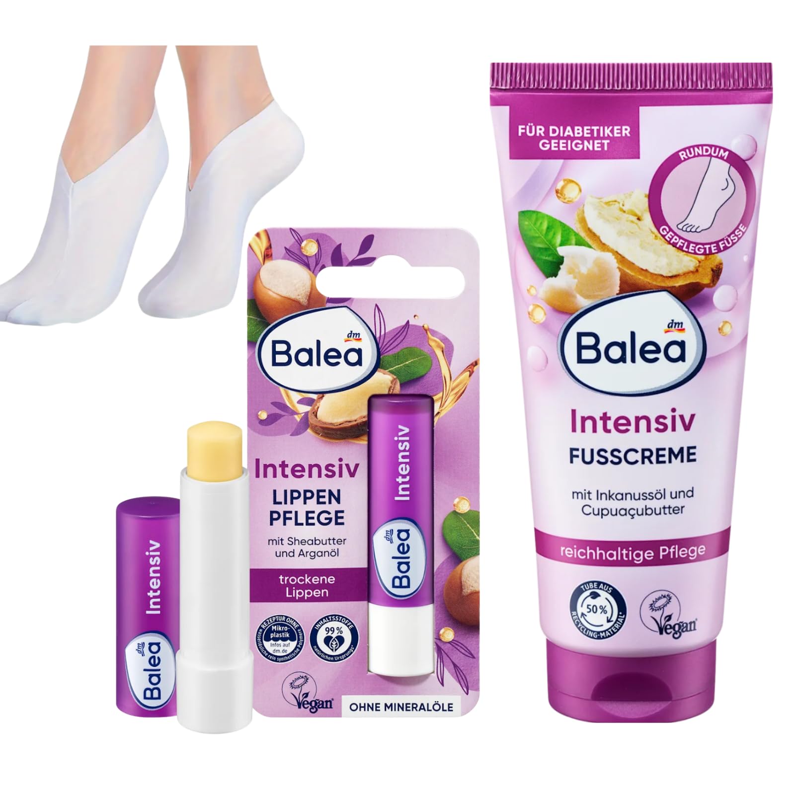 Head-to-toe care – with the BaleaPRO care kit for soft feet and supple lips. This duo combines two particularly rich care products for intense hydration, protection, and noticeable suppleness – complemented by bonus socks for dry feet for a spa-like feeling at home. Balea Intensive Foot Cream with Incan Nut Oil, Almond Oil, and Cupuaçu Butter intensely nourishes dry, overworked feet, leaving them soft and velvety. Its rich texture provides long-lasting hydration and ensures a pleasant, cared-for feel on the skin – perfect for daily foot care or a soothing break after a long day. Balea Intensive Lip Balm combines Shea Butter and Argan Oil to create a nourishing formula that instantly moisturizes chapped lips and provides long-lasting hydration. It protects against dryness and leaves lips soft and cared for – day after day. In addition, the bonus socks for dry feet pamper the skin by intensifying the nourishing effect of the foot cream, for visibly cared-for and delicate feet overnight. A complete care kit for silky-soft feet and velvety lips – perfect for your daily wellness routine. SAFETY WARNING: Apply in the evening after cleansing to the face, neck, and décolleté. Massage gently. Avoid the eye area.For a spa-like experience at home: soft feet and velvety lips, the perfect everyday pampering kit. Bonus socks included: enhance the nourishing effect of the foot cream – ideal for deep overnight regeneration. Naturally cared-for skin: free from microplastics and water-soluble synthetic polymers, gentle and effective. Intensive lip care: shea butter and argan oil moisturize lips and protect them from dryness. Rich foot care: with incan nut oil, almond oil, and cupuaçu butter – gently and soothingly cares for dry feet. Complete care duo: intensive foot cream and lip care – for pampered skin from head to toe.Lot de 2 - Crème Pieds Intensive 100ml Soin Lèvres Intensif 4,8g Bonus Chaussettes Pieds SèchesDESCRIPTION DU PRODUIT DESCRIPTION DU PRODUIT Soin de la tête aux pieds – avec le kit de soin BaleaPRO pour des pieds doux et des lèvres souples. Ce duo combine deux produits de soin particulièrement riches pour une hydratation intense, une protection et une souplesse notable – complété par des chaussettes bonus pour les pieds secs pour une sensation de spa à la maison. La crème intensive pour les pieds Balea à l'huile de noix d'incan, à l'huile d'amande et au beurre de Cupuaçu nourrit intensément les pieds secs et sollicités et les rend doux et veloutés. Sa texture riche hydrate durablement et assure une sensation agréable et soignée sur la peau - Parfait pour les soins quotidiens des pieds ou une pause apaisante après une longue journée. Le baume à lèvres Balea Intensif combine du beurre de karité et de l'huile d'argan pour former une formule nourrissante qui nourrit instantanément les lèvres gercées et les hydrate durablement. Elle protège contre le dessèchement et procure des lèvres douces et soignées - jour après jour. En plus, les chaussettes en bonus pour pieds secs dorlotent la peau en intensifiant l'effet de soin de la crème pour les pieds, pour des pieds visiblement soignés et délicats pendant la nuit. Un kit de soin complet pour des pieds doux et soyeux et des lèvres veloutées – parfait pour votre routine quotidienne de bien-être AVERTISSEMENT DE SÉCURITÉ Appliquer le soir après le nettoyage sur le visage, le cou et le décolleté. Masser doucement. Éviter le contour des yeux.Pour une sensation de spa à la maison : des pieds doux et des lèvres veloutées, le kit de soins parfait pour tous les jours. Chaussettes bonus incluses : soutiennent l'effet de soin de la crème pour les pieds - Idéal pour une régénération en profondeur pendant la nuit. Peau naturellement soignée : sans microplastiques et polymères synthétiques solubles dans l'eau, doux et efficace. Soin intensif des lèvres : le beurre de karité et l'huile d'argan hydratent les lèvres et les protègent contre le dessèchement. Soin des pieds riche : avec de l'huile de noix d'incan, de l'huile d'amande et du beurre de cupuaçu - Soigne les pieds secs en douceur et en douceur. Duo de soin complet : crème pour les pieds intense et soin des lèvres – pour une peau soignée de la tête aux pieds.
