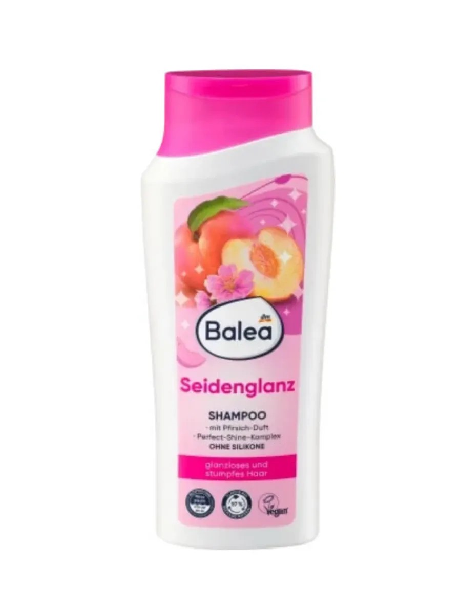Balea Seidenglanz Peach Shampoo, 300 ml. Balea Seidenglanz Shampoo with a restorative complex adds incredible shine to your hair. The formula with a complex of vitamins B3 and B5 cares for hair from root to tip. With regular use, it improves hair structure, making it resistant to external irritants. Free of silicone and microplastics.