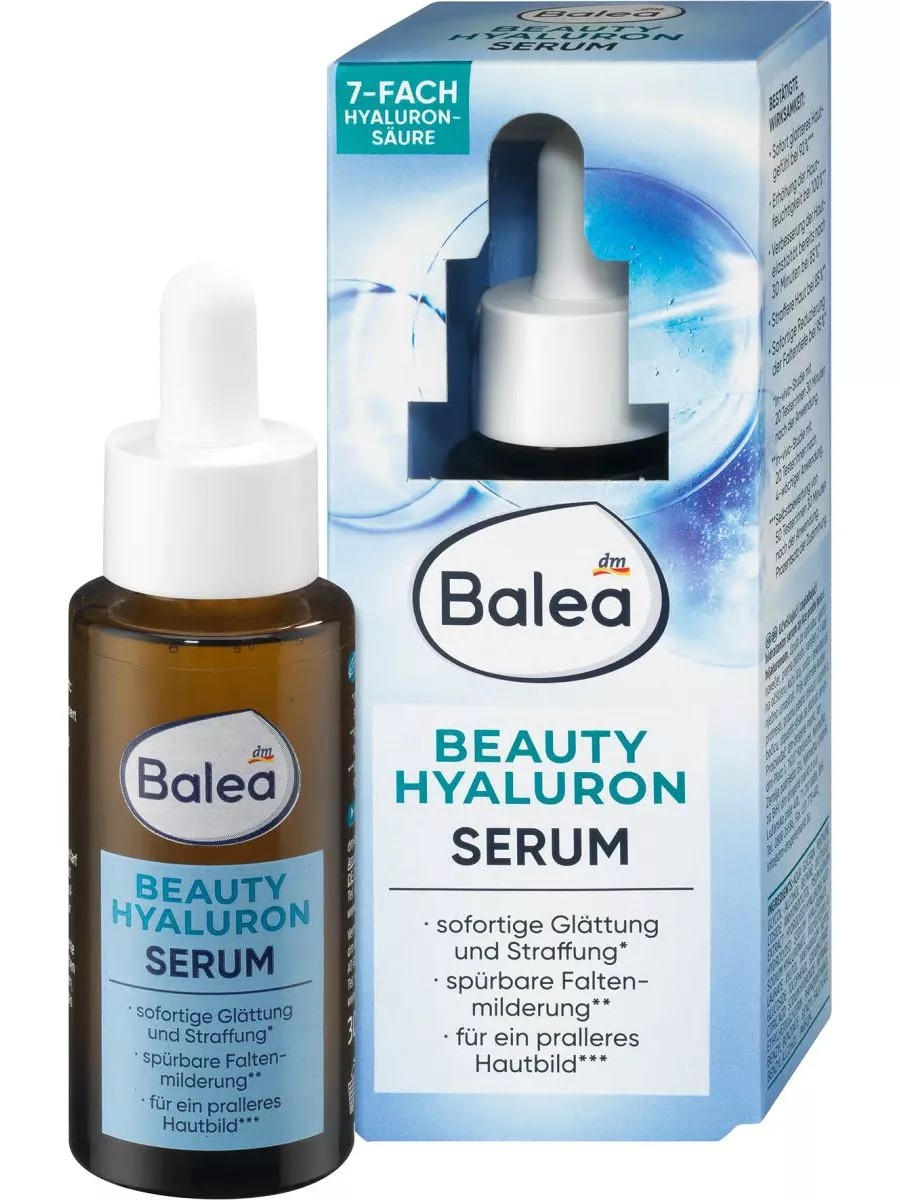 Balea 7-in-1 Beauty Effect Hyaluron 7-Fach Facial Serum with hyaluronic acid instantly hydrates, tightens, and smoothes the skin after the first application. The light texture is quickly absorbed and, with regular use, significantly reduces wrinkles, tightens, and defines facial contours. Hyaluronic acid guarantees smooth skin and increases its elasticity. It improves and refreshes the complexion, eliminating the effect of a "tired face." Ideal as a makeup base and a base for day cream. Formulated without microplastics and water-soluble synthetic polymers. Directions: Apply morning and evening to cleansed skin of the face, neck, and décolleté. Gently massage in. Use as needed.