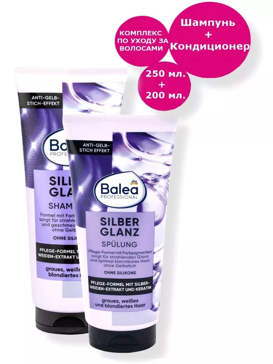 Набор состоит из шампуня объемом 250 мл. и кондиционера для волос объемом 200 мл. Balea Шампунь восстанавливающий Silberglanz с экстрактом коры белой ивы для блондинок. Серебристый шампунь для светлых волос станет незаменимым помощником в нейтрализации желтого пигмента, остающегося в волосах после обесцвечивания и окрашивания блондирующими красителями. Мягкая формула шампуня бережно очищает волосы, придавая им натуральный блеск и эластичность. Шампунь обладает легким тонирующим эффектом, что позволяет избавиться от нежелательной желтизны волос и придать им благородный серебристый оттенок. Шампунь мягко ухаживает за волосами после любого химического воздействия, устраняя пористость ихструктуры и возвращая эластичность и гибкость. Не содержит силикон, микропластик и водорастворимые синтетические полимеры. Не подходит для естественных блондинок. Balea Кондиционер Professional Silberglanz с экстрактом коры белой ивы для блондинок. Серебристый бальзам с специальными цветными пигментами для светлых волос станет незаменимым помощником в нейтрализации желтого пигмента, остающегося в волосах после обесцвечивания и окрашивания блондирующими красителями. Бальзам питает и увлажняет поврежденные волосы и придает максимальный серебряный блеск. Обладает антистатической формулой. Не содержит силикон, микропластик и водорастворимые синтетические полимеры. Не подходит для натуральных блондинок.