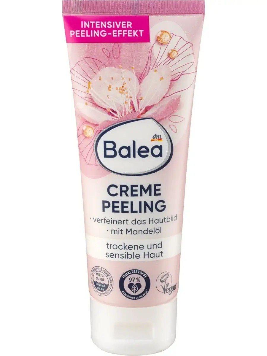 Improves the appearance of skin. A rich and delicate creamy formula with almond oil. Skin becomes visibly smoother and softer. Balea Peeling Cream improves the appearance of skin. Fine mineral exfoliating grains made from lava stone remove dead skin cells and thoroughly cleanse. The rich formula with almond oil helps maintain the skin's natural moisture balance. This formula is free of microplastics and water-soluble, purely synthetic polymers. Apply to damp skin 1-2 times a week. Gently massage in a circular motion. Avoid the eye area. Rinse with warm water. Do not use on acne or varicose veins.