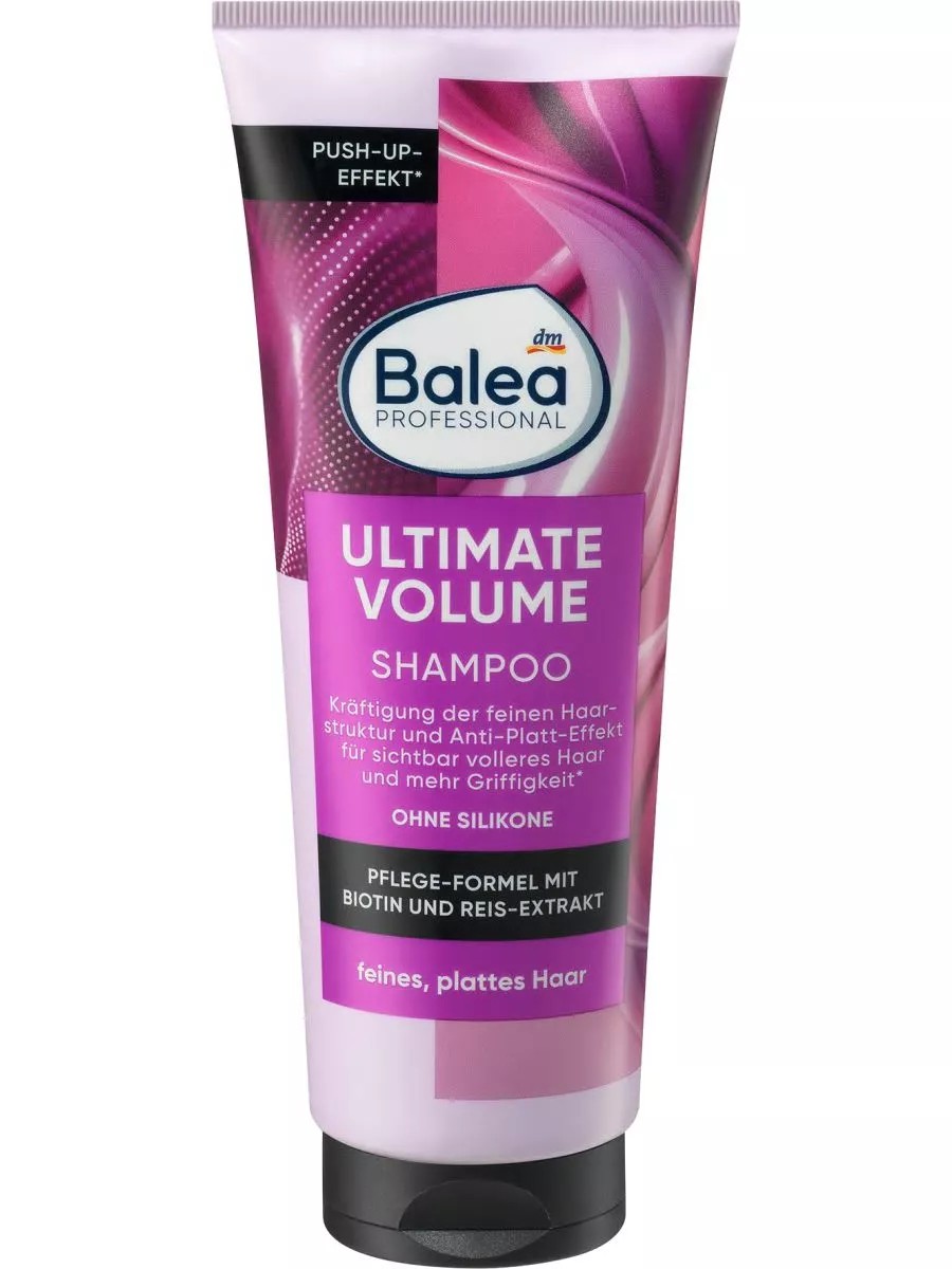 Шампунь Ultimate Volume от Balea Professional поможет укрепить структуру тонких, плоских волос. Благодаря эффекту Push-up обеспечивает оптический объем и лучшую фиксацию. Шампунь бережноочищает волосы по всей длине и заботится о коже головы. Невесомая формула с биотином и экстрактом риса мгновенно делает ваши волосы более сильными, послушными и блестящими, при этом не утяжеляя их. Не содержит силикон, микропластик и водорастворимые синтетические полимеры. Подходит для ежедневного использования. Для достижения лучшего эффекта рекомендуем использовать вместе с кондиционером Balea Professional Ultimate Volume в комплексе.