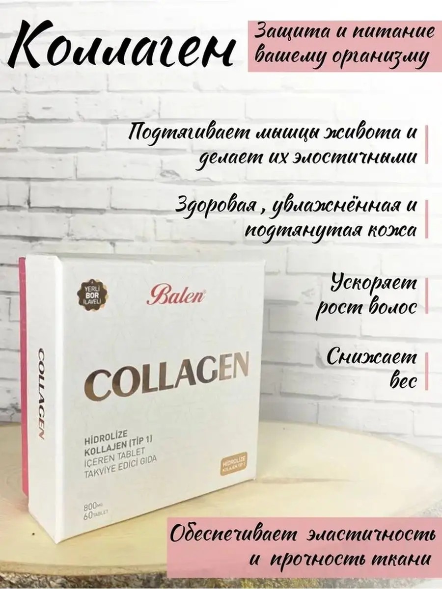 Collagen from the Turkish company Balen! Collagen is a natural protein in the body, which is the basis of connective tissue, providing elasticity and strength! Collagen is what we are made of! Up to 25 years old, the body produces this protein itself, but with age, production slows down, and eventually disappears altogether! This is what the first wrinkles after 25 years are associated with. By the way, for all mothers who still have a postpartum belly, collagen has a powerful regenerating effect, it tightens the abdominal muscles and makes them elastic! So, collagen gives us: Healthy, moisturized, toned skin, strong hair and nails; Accelerated growth of nails, eyelashes, eyebrows and hair, the quality of which is noticeably improved. Acceleration of metabolism, namely metabolism, due to which excess weight begins to go away. Protection and nutrition for our body. Composition of one tablet: Hydrolyzed collagen (type 1) - 450 mg. Grape seed extract - 130 mg. Galuronic acid - 45 mg. Vitamin C - 30 mg. Vitamin E - 10 mg. Zinc - 7 mg. Boron - 1 mg. Biotin - 1000 mkg. Daily dose: Adults (persons 11 years and older) are recommended to take 1 tablet once a day. Contraindications: Pregnant and lactating women should consult a doctor before using collagen. Also in the presence of a chronic disease and taking medications. Volume: 60 tablets 800 mg. Made in Turkey.