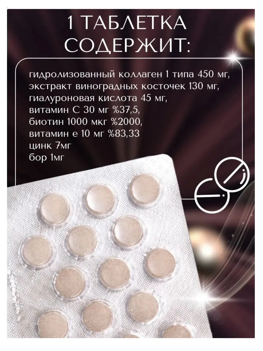 Composition of one tablet: Hydrolyzed collagen (type 1) - 450 mcg. Grape seed extract - 130 mcg.