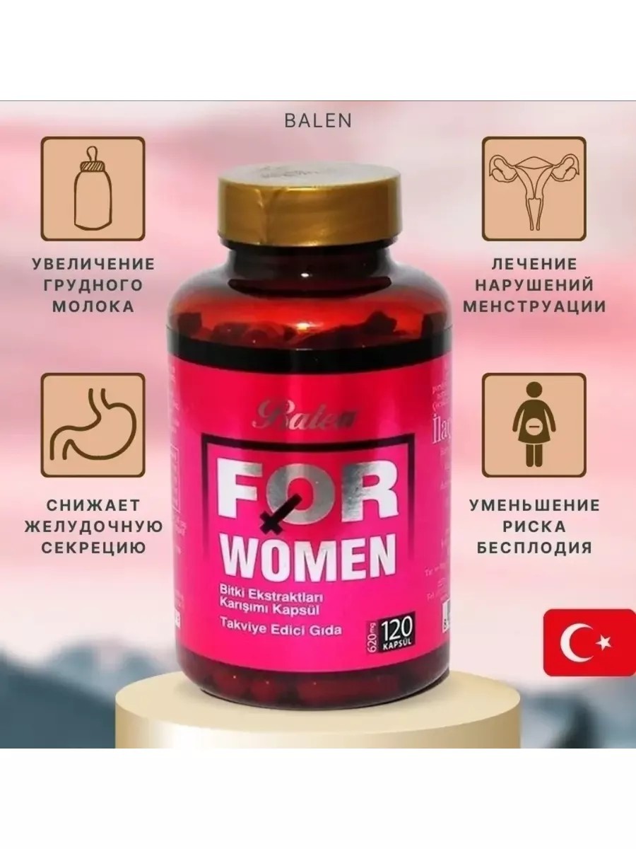 Добрый день покупатель.Задавайте вопросы,оставляйте отзывы. Нам важно знать ваше мнение для более качественного обслуживания ваших потребностей!!! Экстракты витамина для женщин содержат четыре натуральные травы : женьшень , экстракт тысячелистника , манжетка обыкновенная , витекс порошок . For women - произведён исключительно для женщин, оказывает положительное влияние на регуляцию менструального цикла, облегчает боли и спазмы благодаря содержащимся в нём натуральным экстрактом. Помогает уменьшить выработку гормона андрогена и способствует высвобождению гормона эстрогена. Экстракт дягиля - помогает улучшить кровообращение и усилить приток крови к органам таза. Благодаря этому он может стимулировать скудные или отсутствующие менструации. Экстракт дягиля также благотворно воздействует на матку и нервную систему. Экстракт тысячелистника нормализует гормональный фон, улучшает самочувствие при климаксе и болезненных менструациях. На фоне употребления препарата повышается либидо, сохраняются бодрость и общий тонус.Экстракт манжетки альпийской - Помогает при проблемах с менструацией и кровяным давлением, облегчает симптомы менопаузы, помогает облегчить диарею, защищает печень, оказывает противовирусное воздействие. Порошок витекса священного имеет гормоноподобное свойство. Его активные вещества по действию похожи на влияние прогестерона. Это помогает нормализовать работу репродуктивной сферы женщины. Комплекс витамин для женщин улучшают функцию репродуктивной и мочевой системы у женщин и помогают им улучшить венозное кровообращение, кровоостанавливающее и снижающее желудочную секрецию, стенокардия и нарушения кровообращения , лечение комковатой фиброзно-кистозной груди , женское бесплодие , предотвращение выкидыша у женщин . Не содержит искусственных красителей , консервантов и ароматизаторов . Мультивитаминный комплекс для женщин от компании BALEN. используется как: витамины для волос и мультивитамины