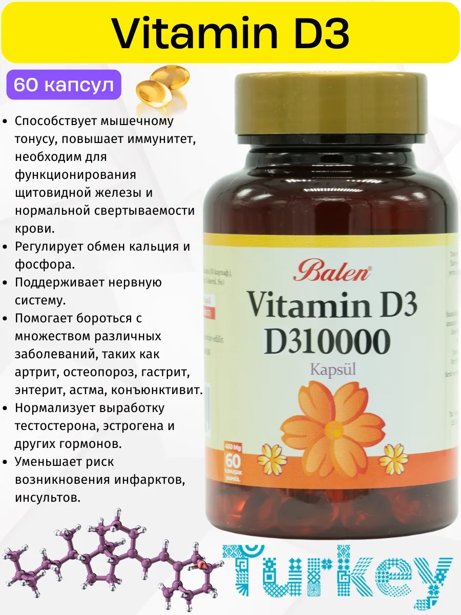 Витамин D310000 Balen - это высококонцентрированная добавка витамина D3, представляющая собой желатиновую капсулу с маслом оливы. Витамин D3, или холекальциферол, является активной формой витамина D, который играет ключевую роль в поддержании здоровья костей, иммунной системы и общего самочувствия.