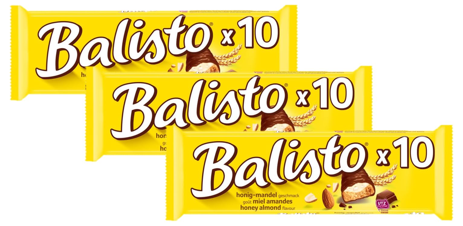 Ingredients: Sugar, wholegrain oat flakes (10 ), sunflower oil, skimmed milk powder, raisins, wholegrain wheat flour (6.7 ), wheat flour, cocoa butter, cocoa mass, shea butter, wholegrain barley flour (2.6 ), hazelnuts, milk fat, lactose, whey permeate (milk), emulsifiers (soy lecithin, E471, sodium stearoyl-2-lactylate), palm fat, fat-reduced yogurt powder (from milk), salt, raising agent (sodium carbonates), coconut oil. May contain: almond. Instructions for use: Between 5 and 22 C. P.when('A').execute(function(A) { A.on('a:expander:toggle_description:toggle:collapse', function(data) { window.scroll(0, data.expander. expander[0].offsetTop-100) }) }) Safety Warning: Do not expose to sunlight. See moreContents: 1x BALISTO Cereal and Milk Chocolate Biscuit Bars, Honey Almond Flavor, 10 x 18.5g, 185g. BALISTO is the irresistible blend of wholegrain biscuits and fresh, delicious fruity ingredients, coated in delicious milk chocolate made from 100 responsibly sourced cocoa. Brighten up boring afternoons, liven up your evenings, and stop cravings. Balisto bars are the perfect snack to take anywhere to make the most of your free time or coffee break. Cereal bars filled with raisins and hazelnuts are ideal as a handy snack to keep on hand for a quick break and a boost of energy. Crispy wholegrain biscuit bars filled with a delicious honey cream studded with almond pieces, coated in smooth milk chocolate. The information below applies to each unit in the pack.Ingrédients Sucre, flocons d' AVOINE complet (10 ), huile de tournesol, LAIT écrémé en poudre, raisins secs, farine de BLÉ complète (6.7 ), farine de BLÉ, beurre de cacao, pâte de cacao, matière grasse de karité, farine d' ORGE complète (2.6 ), NOISETTES, matière grasse du LAIT, LACTOSE, perméat de lactosérum (LAIT), émulsifiants (lécithine de SOJA, E471, Stéaroyl-2-lactylate de sodium), matière grasse de palme, yaourt (à base de LAIT) maigre en poudre, sel, poudre à lever (carbonates de sodium), huile de noix de coco. Peut contenir: AMANDE. Mode d'emploi Entre 5 et 22 C P.when('A').execute(function(A) { A.on('a:expander:toggle_description:toggle:collapse', function(data) { window.scroll(0, data.expander. expander[0].offsetTop-100) }) }) Avertissement De Sûreté Ne pas exposer au soleil. Voir plusContenu : 1x BALISTO Barres Biscuit Céréales et Chocolat au Lait goût Miel Amande, 10 x 18,5g, 185g. BALISTO est le mélange irrésistible de biscuits complets et d'ingrédients fruités frais et délicieux, enrobés de délicieux chocolat au lait fabriqué à partir de cacao provenant à 100 de sources responsables. Égaie les après-midis ennuyeux, anime tes soirées et stoppe les fringales. Les barres Balisto sont le snack parfait à emporter partout pour profiter un maximum de ton temps libre ou de ta pause-café. Des barres aux céréales fourrées de raisins et de noisettes idéales en tant que snack à avoir à portée de main, pour faire une pause et retrouver de l'énergie. Barres de biscuits croustillants aux grains complets fourrées avec une délicieuse crème au miel parsemée d'éclats d'amandes, enrobées de chocolat au lait fondant. Les informations ci-dessous s'appliquent à chaque unité du pack.BALISTO - Barres chocolat et biscuit céréales, lait, miel et amandes - 10 sachets de 18,5g - 185g (Lot de 3)