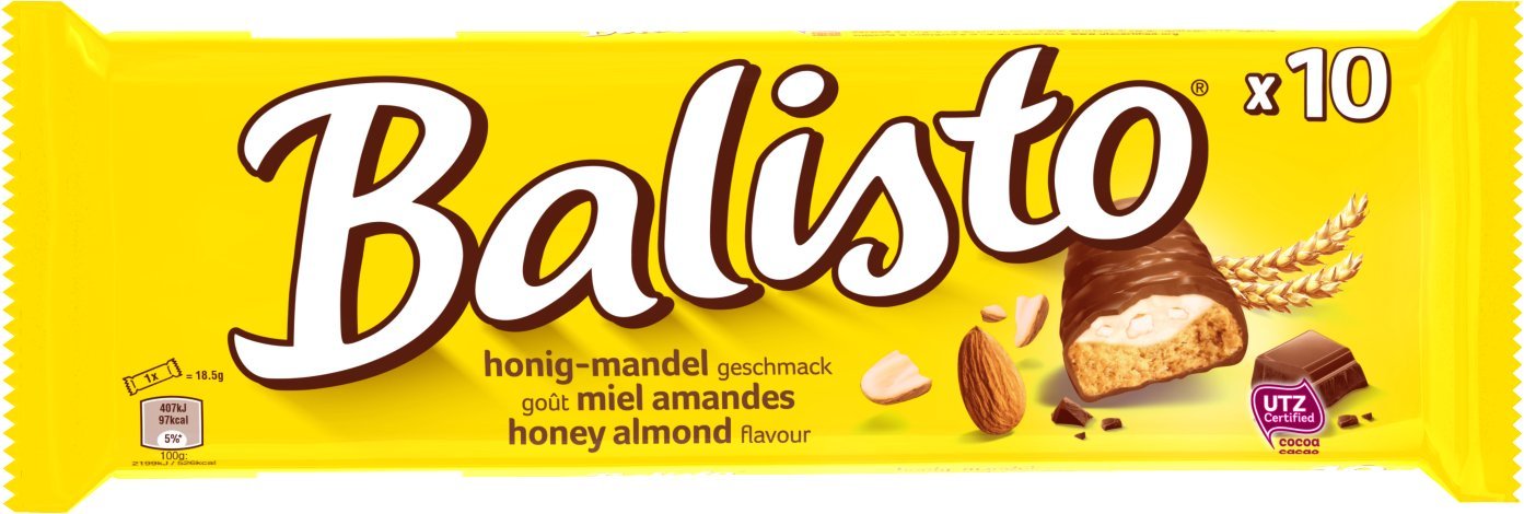 Whole grain biscuit with almond cream, honey flavour, coated in milk chocolate. Chocolate bar. With honey and almonds. INGREDIENTS Sugar, whole grain cereals (19 ) (whole grain oat flakes, whole grain wheat flour, whole grain barley flour), sunflower oil, wheat flour, cocoa butter, almonds (5.0 ), cocoa mass, whole milk powder, skimmed milk powder, shea fat, lactose, concentrated butter (milk), whey powder, emulsifiers (soy lecithin, mono- and diglycerides of fatty acids, sodium stearoyl-2-lactylate), palm fat, salt, raising agent (sodium carbonate), coconut oil, honey, natural flavourings, natural vanilla extract. (May contain: hazelnut). DIRECTIONS FOR USE Store between 13 and 22 SAFETY WARNING Consume promptly after opening. Individually wrapped bags to take anywhere! Ideal for a break or snack. Balisto biscuits contain 36 whole grains, a natural source of fiber. Biscuit aux céréales complètes et crème aux amandes goût miel enrobé de chocolat au lait. Barre chocolatée. Avec miel et amandes. INGRÉDIENTS Sucre, céréales complètes (19 ) (flocons d' Avoine complet, Farine de Blé complète, Farine d' Orge complète), huile de tournesol, Farine de Blé, beurre de cacao, AmandeS (5.0 ), pâte de cacao, Lait entier en poudre, Lait écrémé en poudre, matière grasse de karité, Lactose, beurre concentré (Lait), petit- Lait en poudre, émulsifiants (lécithine de Soja, Mono- et diglycérides d'acides gras, Stéaroyl-2-lactylate de sodium), matière grasse de palme, sel, poudre à lever (carbonate de sodium), huile de noix de coco, miel, arômes naturels, extrait naturel de vanille. (Peut contenir: Noisette). MODE D'EMPLOI Conserver entre 13 et 22 AVERTISSEMENT DE SÛRETÉ Consommer rapidement après ouverture. Sachets emballés individuellement à emporter partout !. Idéal pour la pause ou pour le goûter. Le biscuit de Balisto contient 36 de céréales complètes, sources naturelles de fibres.