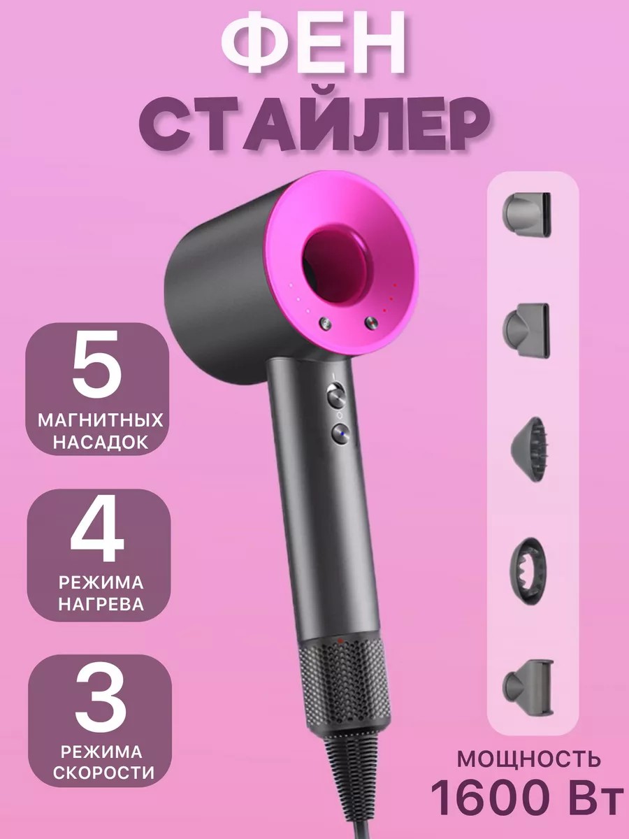 A professional hair dryer – a powerful device that dries quickly, adds volume, and creates a beautiful style. It includes 5 attachments, 4 heat levels, and 3 speeds! Heating up to 100 degrees Celsius quickly dries wet hair, while 80 degrees Celsius (standard care), 60 degrees (gentle warm air drying), and 28 degrees (cool air blast) are available. A set of interchangeable magnetic attachments includes a round nozzle (gentle drying), a diffuser, a nozzle for directed airflow with a wide nozzle for unruly hair, and a concentrator with a narrow nozzle. This brand-name model has a long cord (cable and wire), allowing you to use this compact device comfortably and with complete freedom of movement, even if the electrical outlet is far from your mirror. Function switches are controlled by convenient buttons on the body of the hair dryer. Pros: Ionization features, overheat protection, and a hair dryer with a diffuser for curls that dries and conditions hair, protecting against damage and heat. This versatile, 1600-watt electronic hair dryer is convenient for use at home, on the go, traveling, on business trips, and at the pool. This conveniently designed appliance is suitable for all hair and scalp types: normal, dry, oily, curly, kinky, straight, wavy, frizzy, fine, short, long, medium-length, and any thickness. This quiet, portable device with multiple attachments for different hair types and for styling voluminous bangs is suitable for adults, men, women, girls, boys, and teenagers. A professional hand-held hair dryer for home care is a great gift for your girlfriend, wife, or daughter. It's also a fantastic present for your sister or best friend on their birthday or any other holiday, such as Women's Day, March 8th, Valentine's Day, Mother's Day, or New Year's!