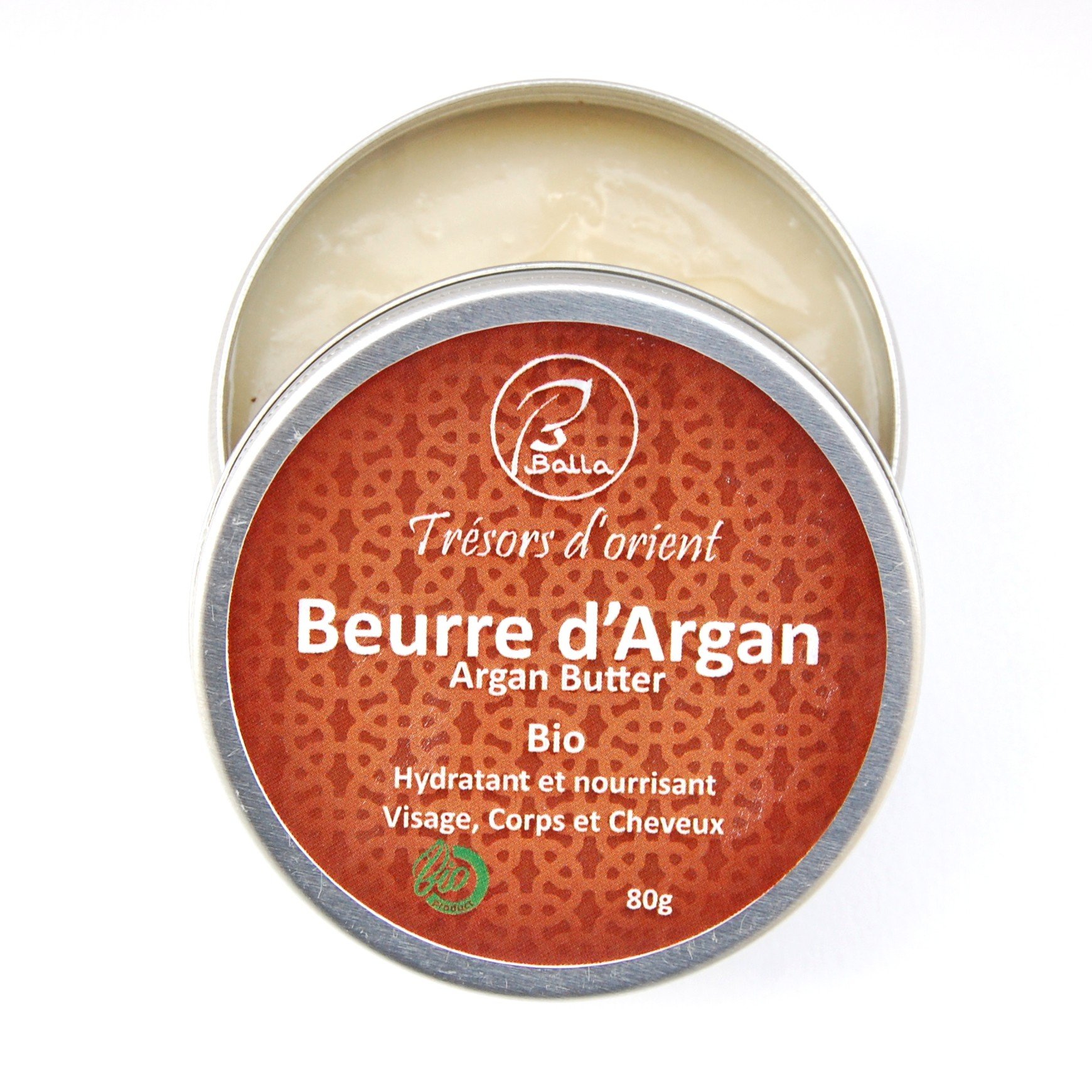 Organic Argan Butter 80g : This silky-textured butter deeply moisturizes, nourishes, and protects the skin. It can be used as a nighttime facial treatment for dry skin and as a repairing treatment for dry and damaged hair. Use on clean skin and hair, ideally after showering. This rich and creamy butter provides up to 24 hours of hydration for all skin types. BALLA COSMETICS INGREDIENTS