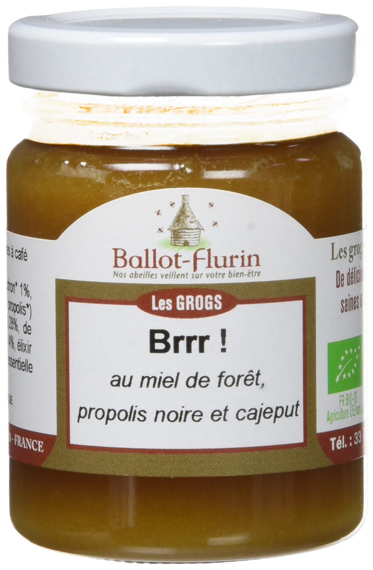 : Warming grog with forest honey, black propolis, and cajeput. Boost your immune system. Protect yourself from the cold. Ingredients: Forest honey (France Spain) 97 , lemon juice 1 , black propolis extract (eau-de-vie , propolis (France Spain)) 0.71 , essential oils of cajeput 0.28 , grapefruit 0.28 , and cinnamon 0.14 , beehive elixir (hive wood) 0.1 , clove essential oil 0.04 . Ingredients from organic farming. Certified by FR-BIO-10.Mix well before use. Once a day, preferably in the evening, dilute 2 teaspoons in a cup of simmering water. Drink warm and slowly. Boost your immune system. Protect yourself from the cold. Honey drink, to be diluted.Description du produit Grog réchauffant au miel de forêt, propolis noire et cajeput. Stimulez vos défenses immunitaires. Protégez-vous du froid. Ingrédients Miel de forêt (France Espagne) 97 , jus de citron 1 , extrait de propolis noire (eau de vie , propolis (France Espagne)) 0,71 , huiles essentielles de cajeput 0,28 , de pamplemousse 0,28 et de canelle 0,14 , élixir de la ruche bois de ruche 0,1 , huile essentielle de clou de girofle 0,04 . ingrédients issus de l'agriculture biologique. Certifié par FR-BIO-10.Bien mélanger avant emploi. 1 fois par jour, de préférence le soir, diluer 2 cuillères à café dans une tasse d'eau frémissante. Boire chaud et doucement. Stimulez vos défenses immunitaires. Protégez-vous du froid. Boisson au miel, à diluer.Ballot-Flurin Brr ! Grog 125 g - BIO