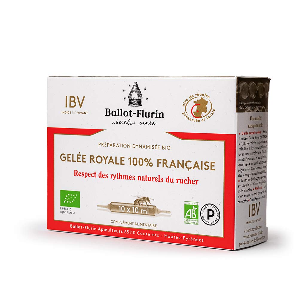 REGENERATES REVITALIZES New formula 2018: More concentrated in royal jelly, we go from 210mg to 260mg per ampoule. Our recipe, inspired by bees, combines the benefits of royal jelly with the good taste of acacia honey to regenerate and revitalize the body. RICH IN ACTIVE BEEPY INGREDIENTS • Organic French royal jelly: It is a powerful physical and mental rejuvenator. Helps protect the body, increases vital energy and libido, improves the quality of sleep. • Organic acacia honey: Acts in synergy with royal jelly for optimal assimilation. AN EXCEPTIONAL QUALITY OF FRENCH ORGANIC ROYAL JELLY Secreted by nurse bees, this noble nutrient allows the queen to live 40 times longer than the worker. The fragility of its active ingredients requires great rigor in preparation Harvested during the honey flow period Breeding, selection and natural preservation of queens Rich in 10HDA compound Filtered manually with a simple fine cloth No centrifugation, no freezing Processed by hand in the hours following harvest Respect of the lunar planetary calendar Preserved and centuries-old foraging areas rich in medicinal plants WHY IS OUR ROYAL JELLY RICHER AND MORE ACTIVE? Handcrafted from our bees, raised with love 100 of the beekeeping raw materials are obtained and controlled according to our supportive and local DOUCE Apiculture charter 100 organic beekeeping materials from apiaries installed in local micro-terroirs. Ballot-Flurin maintains rigorous artisanal manufacturing. Our bees only forage on flowers from preserved, very rich and centuries-old foraging areas. Royal Jelly is harvested in the South-West during the honey flow, at a rate of only a few grams per hive, from May to August. Our preparations are energized by slow manual stirring in honey, for maximum assimilation by the body and good conservation at room temperature. Apitherapy Advice 10-day cure: one ampoule per day in the morning on an empty stomach for a beneficial action. Shake well before opening. Drink slowly, leaving each sip under the tongue and mixing with saliva before swallowing. INGREDIENTS spring water, acacia honey , energized French royal jelly . Ingredients from organic farming. Certified by Qualité-France SAS - FR BIO-10 European Union DIRECTIONS FOR USE 10-day cure: one ampoule per day in the morning on an empty stomach for a beneficial action. Shake well before opening. Drink slowly, leaving each sip under the tongue and mixing with saliva before swallowing. FOOD SUPPLEMENT: Does not replace a varied and balanced diet and a healthy lifestyle. Do not exceed the recommended daily dose. Keep out of reach of young children. 10-DAY PROGRAM: One ampoule per day in the morning on an empty stomach. Shake before opening. Drink slowly and mix with saliva before swallowing. GENTLE, NON-POLLUTING MANUFACTURING: Very high-quality organic beekeeping active ingredients, obtained using gentle extraction methods that are non-polluting for the environment. Made in France, in our zero-waste bulb factory in the Hautes-Pyrénées. NO KILL: Our royal jelly is obtained without killing the queen and respecting the bees, which are fed on flowers from biodiverse terroirs in organic and wild areas. While respecting their natural rhythms. Without any addition of food or non-organic chemical treatments. Organic French Royal Jelly: 100 French, our organic royal jelly is harvested in France and lovingly packaged in the Pyrenees. Secreted by nurse bees, this noble nutrient allows the queen to live 40 times longer than the worker bee. RÉGÉNÈRE REVITALISE Nouvelle formule 2018 : Plus concentrée en gelée royale on passe de 210mg à 260mg par ampoule. Notre recette inspirée des abeilles, associe les bienfaits de la gelée royale au bon goût de miel d'acacia pour régénérer et revitaliser l'organisme. RICHES EN PRINCIPES ACTIFS APICOLES • Gelée royale française bio : C'est un puissant régénérant physique et mental. Aide à protéger l'organisme, augmente l'énergie vitale et la libido, améliore la qualité du sommeil. • Miel d'acacia bio : Agit en synergie avec la gelée royale pour une assimilation optimale. UNE QUALITÉ DE GELÉE ROYALE BIO FRANÇAISE EXCEPTIONNELLE Sécrétée par les abeilles nourricières, ce noble nutriment permet à la reine de vivre 40 fois plus longtemps que l'ouvrière. La fragilité de ses principes actifs exige une grande rigueur de préparation Récoltée en période de miellée Élevage, sélection et préservation naturelle des reines Riche en composé 10HDA Filtrée manuellement avec une simple toile fine Pas de centrifugation, pas de congélation Transformée à la main dans les heures suivants la récolte Respect du calendrier lunaire planétaire Zones de butinages préservées et séculaires riches en plantes médicinales POURQUOI NOTRE GELÉE ROYALE EST-ELLE PLUS RICHE ET PLUS ACTIVE ? Fabrication artisanale issue de nos abeilles, élevées avec amour 100 des matières premières apicoles sont obtenues et contrôlées selon notre charte d'Apiculture DOUCE solidaire et locale Matières apicoles 100 bio issues des ruchers installés dans des micro-terroirs locaux. Ballot-Flurin maintient une fabrication artisanale rigoureuse Nos abeilles butinent uniquement des fleurs issues de zones de butinage préservées, très riches et séculaires. La Gelée Royale est récoltée dans le Sud-Ouest en période de miellée, à raison de quelques grammes seulement par ruche, du mois de mai au mois d'août. Nos préparations sont dynamisées par un lent brassage manuel dans le miel, pour une assimilation maximale par l'organisme et une bonne conservation à température ambiante. Conseils d'Apithérapie Cure de 10 jours : une ampoule par jour le matin à jeun pour une action bénéfique. Bien agiter avant ouverture. Boire lentement, laisser chaque gorgée sous la langue et mélanger avec la salive avant d'avaler. INGRÉDIENTS eau de source, miel d'acacia , gelée royale française dynamisée. Ingrédients issus de l'a