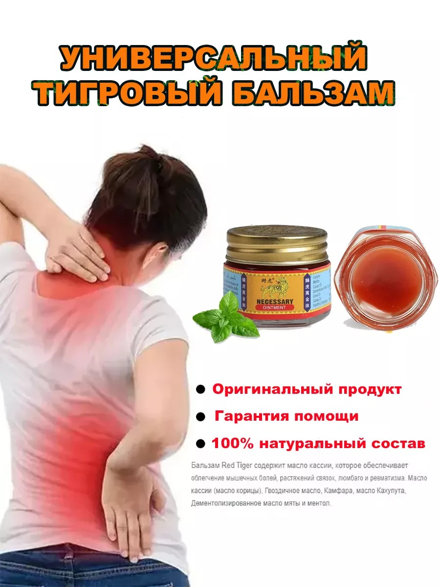 Разогревающий бальзам для наружного применения. Обладает широким спектром действия. Уникальный травяной состав бальзама основан на древнем китайском рецепте. Этот состав используется многие столетия в странах юго-восточной Азии. Тигровый бальзам - это мощный анальгетик. Тайцы используют красный бальзам как универсальное средство: при переломах для более быстрого сращивания костей, при болях в суставах, а также для массажа, при головных болях втирают в виски, затылочную кость и шею. *Показания:* растяжения, перенапряжения мышц, связок, ушибы мышц, подготовка мышц к нагрузкам и спортивным состязаниям, неврит, бурсит, миалгия, головные боли, мигрени, укусы насекомых, простудные заболевания. Способ примения: нанесите тигровый бальзам мягко на пораженный участок, чтобы уменьшить боль, отек и другие неприятные ощущения быстро и эффективно. Только для наружного применения.