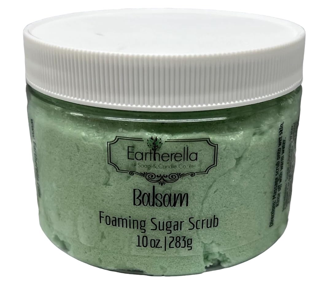 This is a 10 oz jar of our Foaming Sugar Scrubs in the Balsam scent. This scrub gently exfoliates and polishes your skin. You will leave the shower feeling fresh, revitalized, smooth and moisturized. Our sugar scrubs are a soap, so use like you would any soap or body wash, or as an exfoliant after washing with soap. Our scrubs will foam up and exfoliate your skin, as well as clean you and make your skin feel amazing. Sugar is a gentle exfoliant that helps remove dead skin cells and softens your skin as well. It is gentle enough to even use on your face. Use it just like you would any other soap! Directions: Massage a small amount of sugar scrub onto wet skin. Rinse off with warm water. Ingredients: Sugar, Glycerin, Water, Sodium Cocoyl Isethionate, Sorbitol, Propylene Glycol, Disodium Lauryl Sulfosuccinate, Stearic Acid, Sodium Chloride, Diazolidinyl Urea, Iodopropynyl Butylcarbamate, Fragrance, Polysorbate 80, Colorant