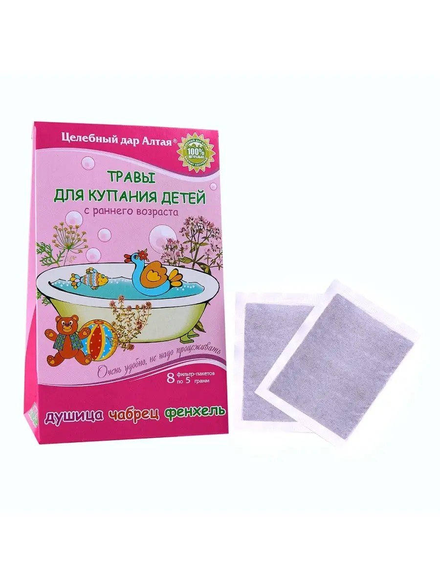 Рекомендуется применять в качестве средства по уходу за кожей детей с раннего возраста. Травяные ванны с душицей, чабрецом и фенхелем снимают повышенный мышечный тонус, улучшают сон, нормализуют состояние кожи при потничке и опрелостях, благоприятно воздействуют на общее состояние здоровья ребенка. Форма выпуска очень удобна в применении, не требует процеживания, доставляет максимум удовольствия и пользы. Способ приготовления: 1-2 фильтр-пакета залить 1 л горячей воды, настоять 10-15 минут, приготовленный настой вылить в ванну с теплой водой. Так же возможно положить пакетики сразу в ванночку с теплой водой незадолго до купания. Противопоказания: индивидуальная непереносимость отдельных компонентов продукта.