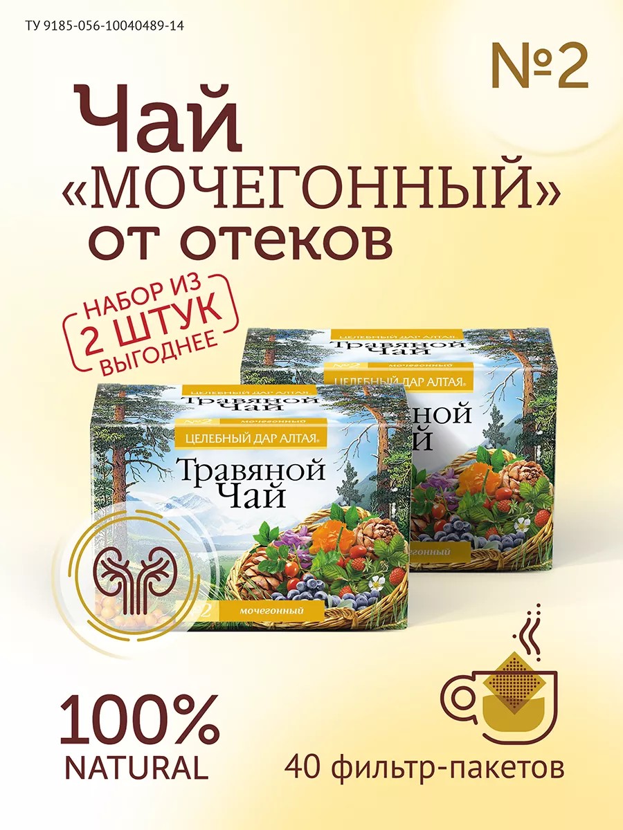 Натуральные травяные чаи серии «Целебный дар Алтая» перенесут Вас в самое сердце Алтая, наполнят здоровьем сибирской тайги, бодростью горных рек, силой могучих гор. Коллекция чаев изготовлена из ценнейших лекарственных растений, ягод и плодов. Наряду с неповторимым вкусом и ароматом наши чаи обладают полезными свойствами: помогают бороться с авитаминозом, укрепляют иммунитет в период простуд, восстанавливают организм после болезни, придают бодрости, заряжают энергией. Травяной чай "Мочегонный" обладает противовоспалительным и мягким мочегонным действием, снимает отеки, оптимизирует водно-солевой баланс, способствует нормализации артериального давления, препятствует образованию камней. Способ применения: для приготовления напитка 1 фильтр - пакет залить 1 стаканом кипятка (200 мл), настоять 10-15 мин. Принимать по 1 стакану 2-3 раза в день во время еды. Также можно запарить чай в термосе, из расчета 2 фильтр-пакета на 1 литр кипятка. При желании добавьте в чашку 1-2 чайных ложки ягодного сиропа нашей серии "Целебный дар Алтая" или меда. Противопоказания: индивидуальная непереносимость отдельных компонентов продукта.
