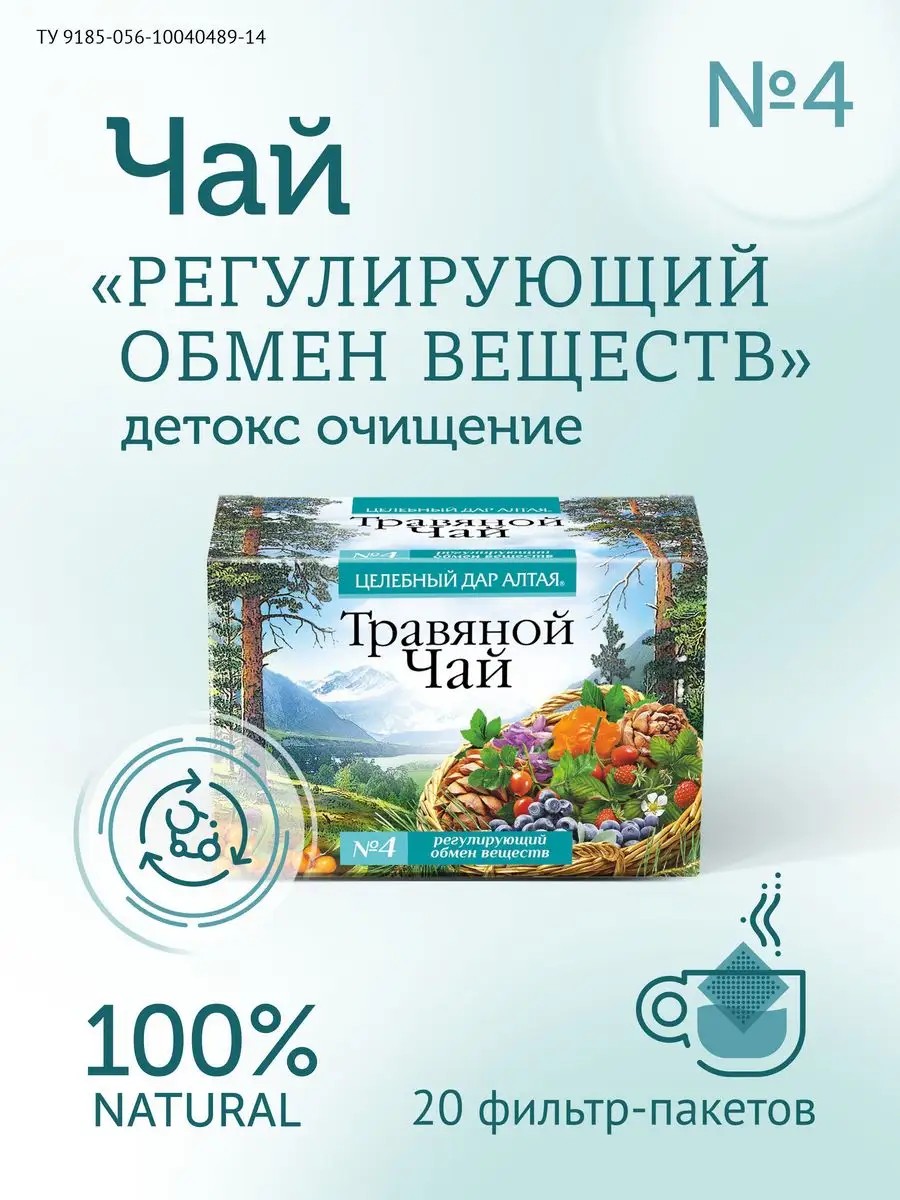 Натуральные травяные чаи серии «Целебный дар Алтая» перенесут Вас в самое сердце Алтая, наполнят здоровьем сибирской тайги, бодростью горных рек, силой могучих гор. Коллекция чаев изготовлена из ценнейших лекарственных растений, ягод и плодов. Наряду с неповторимым вкусом и ароматом наши чаи обладают полезными свойствами: помогают бороться с авитаминозом, укрепляют иммунитет в период простуд, восстанавливают организм после болезни, придают бодрости, заряжают энергией. Травяной чай "Регулирующий обмен веществ" улучшает углеводный и жировой обмен, стимулирует моторику кишечника, способствует очищению организма от зашлакованности. Рекомендуется принимать для похудения, проведения эффективной чистки организма. Способ применения: для приготовления напитка 1 фильтр-пакет залить 1 стаканом кипятка (200 мл), настоять 10-15 мин. Принимать по 1 стакану 2-3 раза в день во время еды. Также можно запарить чай в термосе, из расчета 2 фильтр-пакета на 1 литр кипятка. При желании добавьте в чашку 1-2 чайных ложки ягодного сиропа нашей серии "Целебный дар Алтая" или меда. Противопоказания: индивидуальная непереносимость отдельных компонентов продукта.