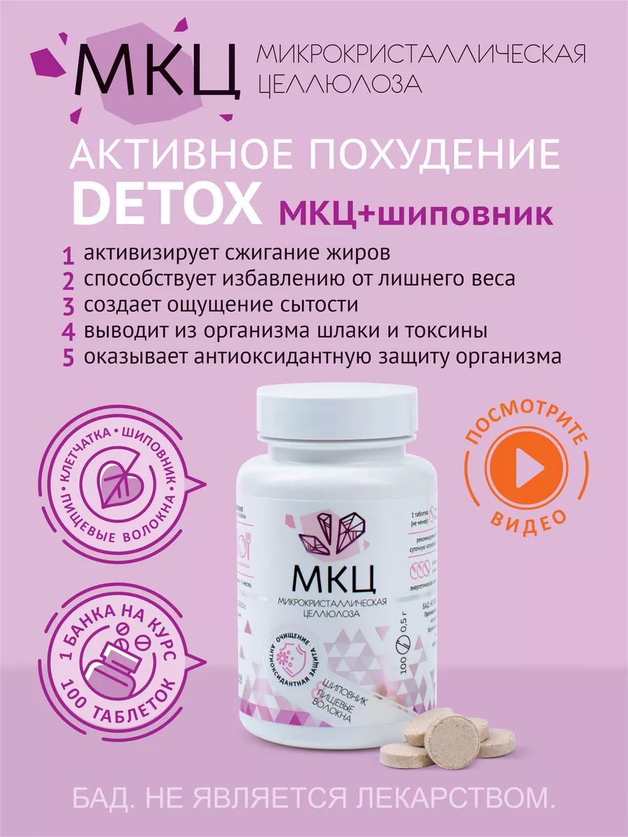 БАД «МКЦ-Дворник» - таблетки для похудения и очищения организма. МКЦ (микрокристаллическая целлюлоза) получают путем переработки хлопковой целлюлозы, которая по своему составу аналогична клетчатке (пищевые волокна) фруктов, овощей и зерновых. Попадая в желудок, МКЦ активно впитывает жидкость и разбухает, увеличиваясь в объеме, чем создает ощущение сытости, притупляя аппетит и чувство голода. Принимая микрокристаллическую целлюлозу, необходимо выпивать достаточное количество воды, не менее 1 стакана (200-250мл) за один прием. МКЦ выводит шлаки и токсины, выполняет функции энтеросорбента, ускоряет транзит пищи через ЖКТ и восстанавливает кишечную микрофлору. Уменьшает всасывание жиров и холестерина, снижает чувство голода и сокращает объемы потребляемой пищи, способствует избавлению от лишнего веса, регулирует обмен веществ. МКЦ дополнительно обогащен шиповником, его биологически активные вещества оказывают антиоксидантную защиту организма, укрепляют иммунитет, повышают физическую и умственную активность, улучшают общее самочувствие. Для оптимального действия следует комбинировать МКЦ с диетой и физической нагрузкой.