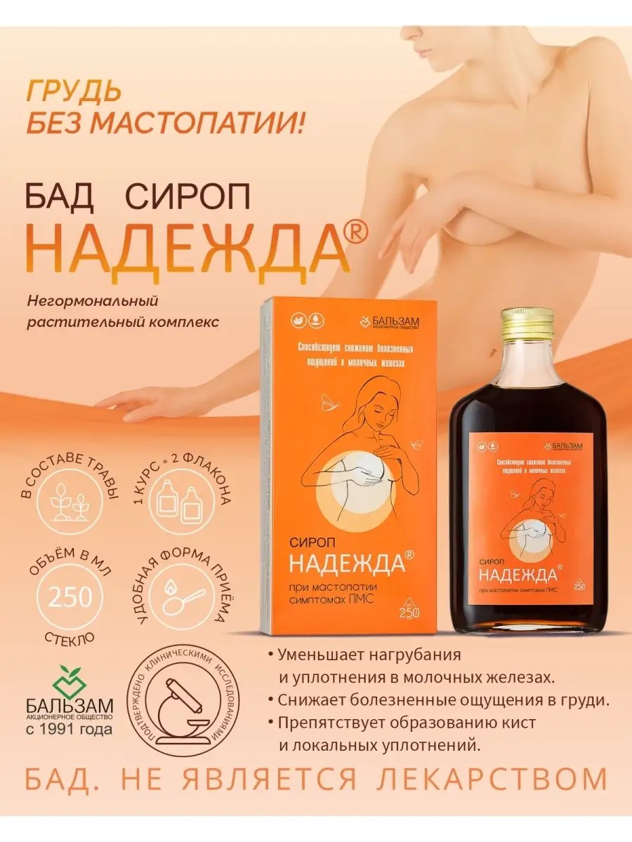 The dietary supplement herbal syrup "Nadezhda" is a non-hormonal drug for mastopathy, mastalgia, and postpartum mastitis.
