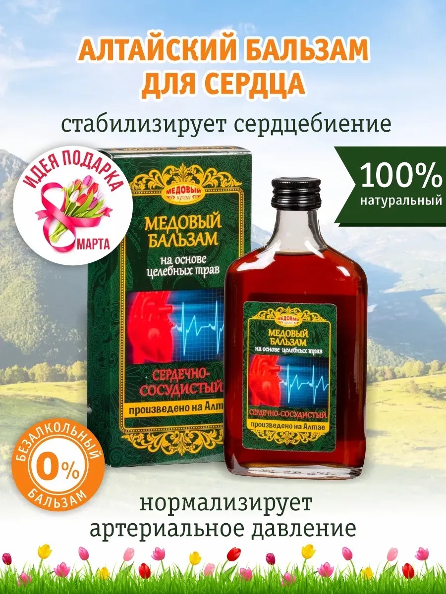 Бальзам Алтайский медовый СЕРДЕЧНО-СОСУДИСТЫЙ применяется для Сердца и Сосудов,имеет в своем составе комплекс натуральных трав. В народной медицине считается, что сочетание данных трав: улучшает функциональное состояние сердечной деятельности и центральной нервной системы, нормализирует артериальное давление, улучшает сон, улучшается кровоснабжение миокарда (сердечной мышцы) и головного мозга, уменьшается одышка, стабилизирует сердцебиение, предотвращают перенапряжение и изнашиваемость сердца, оказывает оздоравливающее действие на организм.