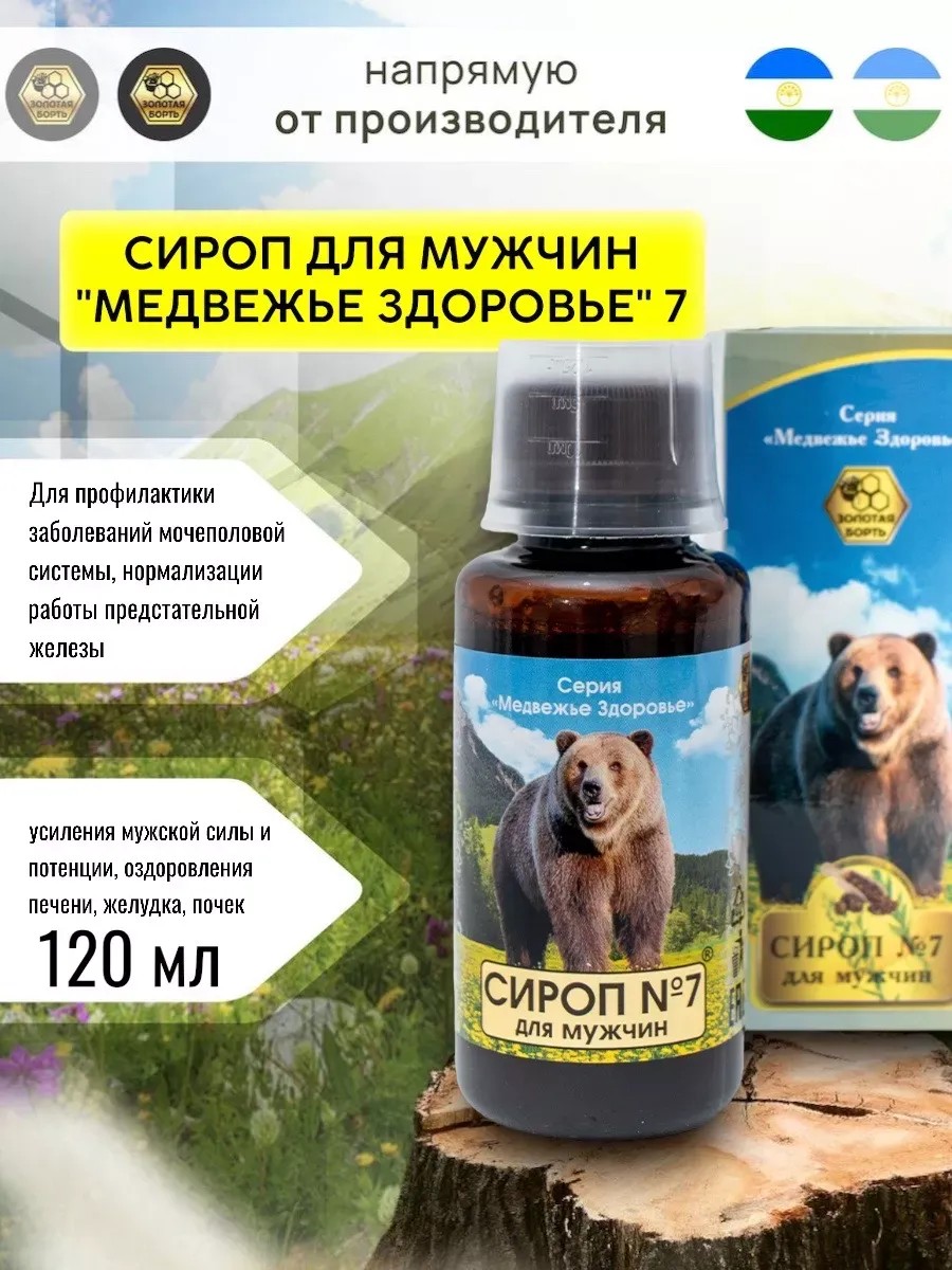 Bear Health Syrup No. 7 for Men, 120 ml, from Zolotaya Bort. During cold and flu season, it's important to support the immune system for both adults and children. This antiviral medication is designed to prevent and maintain children's health. This dietary supplement is available in liquid form, and the pleasant syrup tastes great. This immunomodulatory supplement can be started early, and the illness will pass without consequences or even bypass it altogether. It works in combination with cough medicines or mixtures for colds, viruses, throat infections, or acute respiratory viral infections. A natural remedy. Field pennycress is a good aid in the treatment of impotence at various stages. It has a positive effect on the prostate gland, relieving inflammation and preventing tissue growth. Ginseng is a renowned tonic, restorative, and stimulant. Increases performance, reduces physical and mental fatigue, stimulates sexual function. Improves cardiovascular function. Red root relieves inflammation and calms the nervous system, tones and strengthens the immune system, has an astringent and antioxidant effect, inhibits tumor growth and prevents the appearance of neoplasms. Ivan tea - thanks to the content of flavonoids, trace elements, coumarins and vitamins, treats infectious and inflammatory diseases of the genitourinary system. Benefits for men include improved prostate function and the treatment of impotence. Trace elements, vitamins A, B, C normalize the composition of seminal fluid. Propolis has antimicrobial, antifungal, anti-inflammatory, anesthetic and stimulating properties. Application: For the prevention of genitourinary diseases, normalization of prostate function, enhancement of male potency and potency, improvement of the liver, stomach, kidneys, general strengthening and rejuvenation of the male body. A good tonic, helps restore male reproductive function. Ingredients: Sugar syrup, extracts of field pennycress, ginseng root, red root, fireweed, propolis, citric acid. Shake before use. Take 1 tablespoon twice daily with a small amount of water. Can be added to tea, water, etc. Not a medicine. Shelf life: 12 months. Store at a temperature not exceeding 25°C. Refrigerate the opened product for no more than 45 days. Fruit pulp may be present. Contraindications: Individual intolerance to the components. Use with caution during pregnancy, breastfeeding, and diabetes.