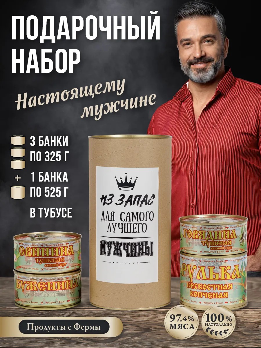 An unusual gift, an original gift set of delicacies and meat products, will be the perfect surprise for February 23rd, for dad's birthday, or for any occasion for a man or husband. It includes stewed meat from the best parts of beef and pork. These meat delicacies have an unusual flavor and are a perfect snack for beer, which will surprise a boss, colleague, or brother. Our interesting combination of meat products is ideal for any beer occasion, including anniversaries, birthdays, New Year's, Christmas, Father's Day, and February 14th. This set of delicious treats will be a wonderful gift for any man: dad, husband, brother, grandfather, uncle, boyfriend, best friend, director, boss, manager, teacher, or colleague. The stylish gift packaging of the meat set, without unnecessary details, gives the gift a special charm, making it perfect for a man. A brutal box of game delicacies is not only a wonderful gift for adults who appreciate unusual flavors, but also a great idea for a delicious gift for your boyfriend, best trainer, or grandfather. These delicacies make a great beer snack, and you can give a surprise box of food to your uncle or as a man's bouquet to a friend.