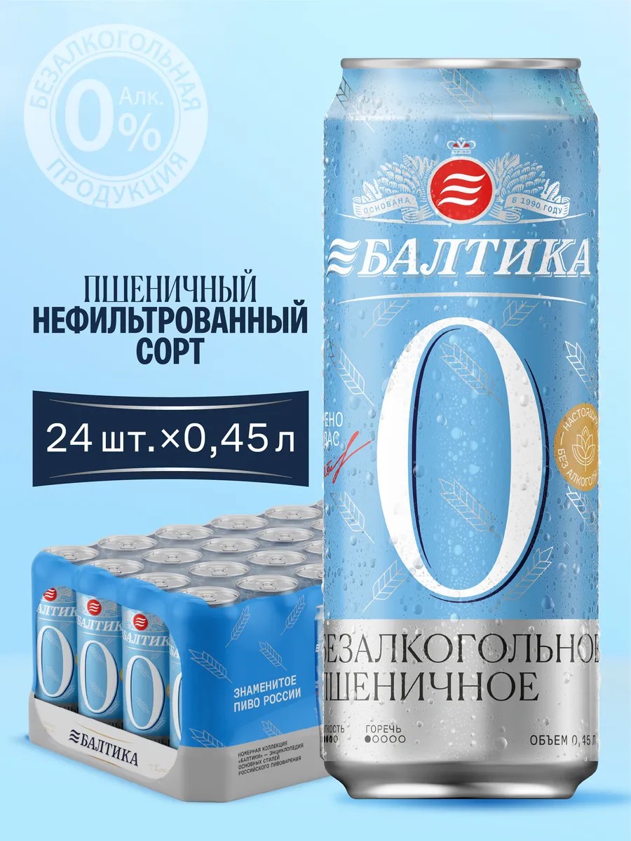 Балтика №0 Пшеничное Нефильтрованное б/а пивной напиток, 24 х 0,45 л