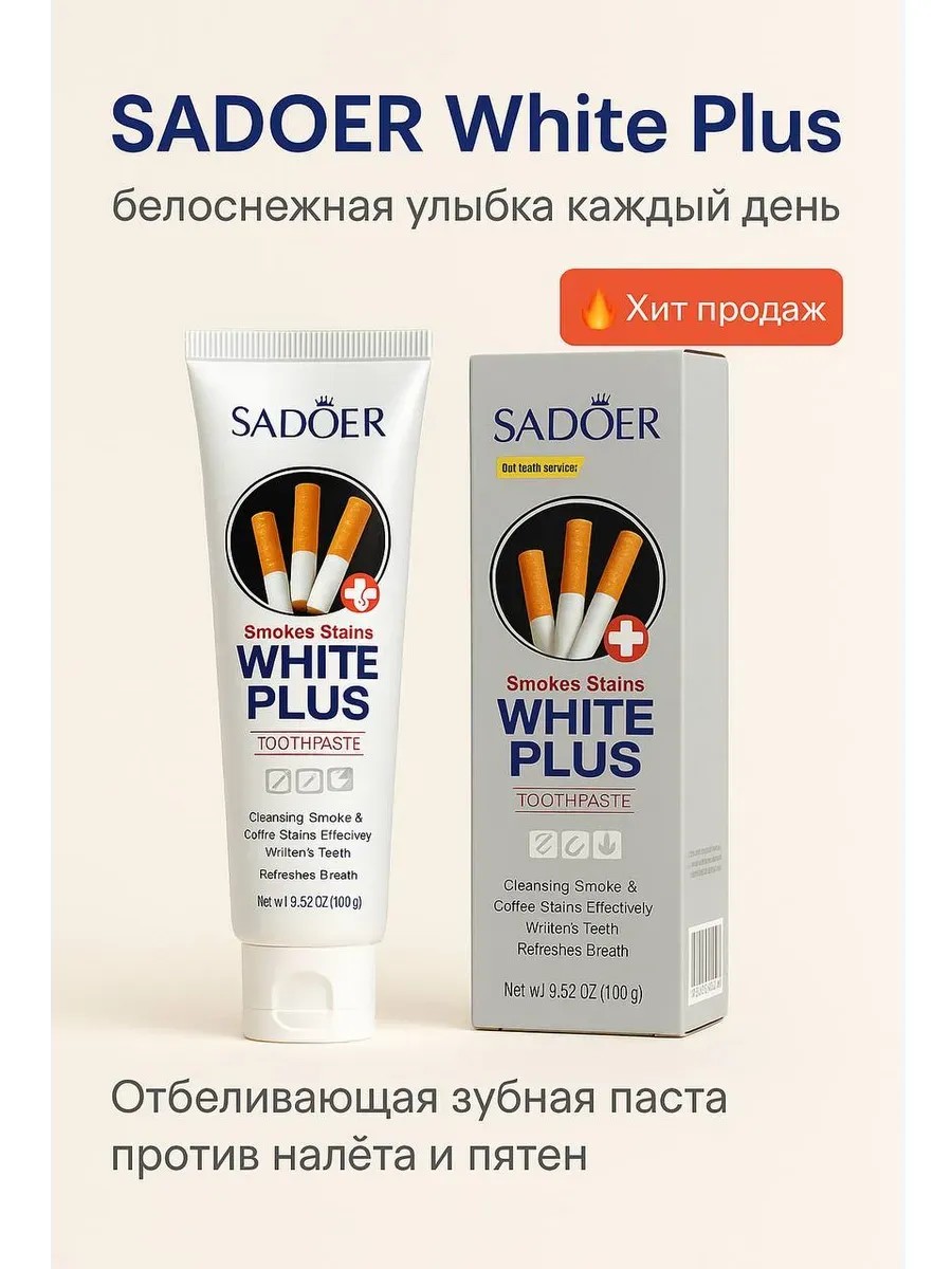 | Полное наименование товара | Зубная паста SADOER White Plus 100 г – отбеливающая против налёта и пятен от кофе и табака |